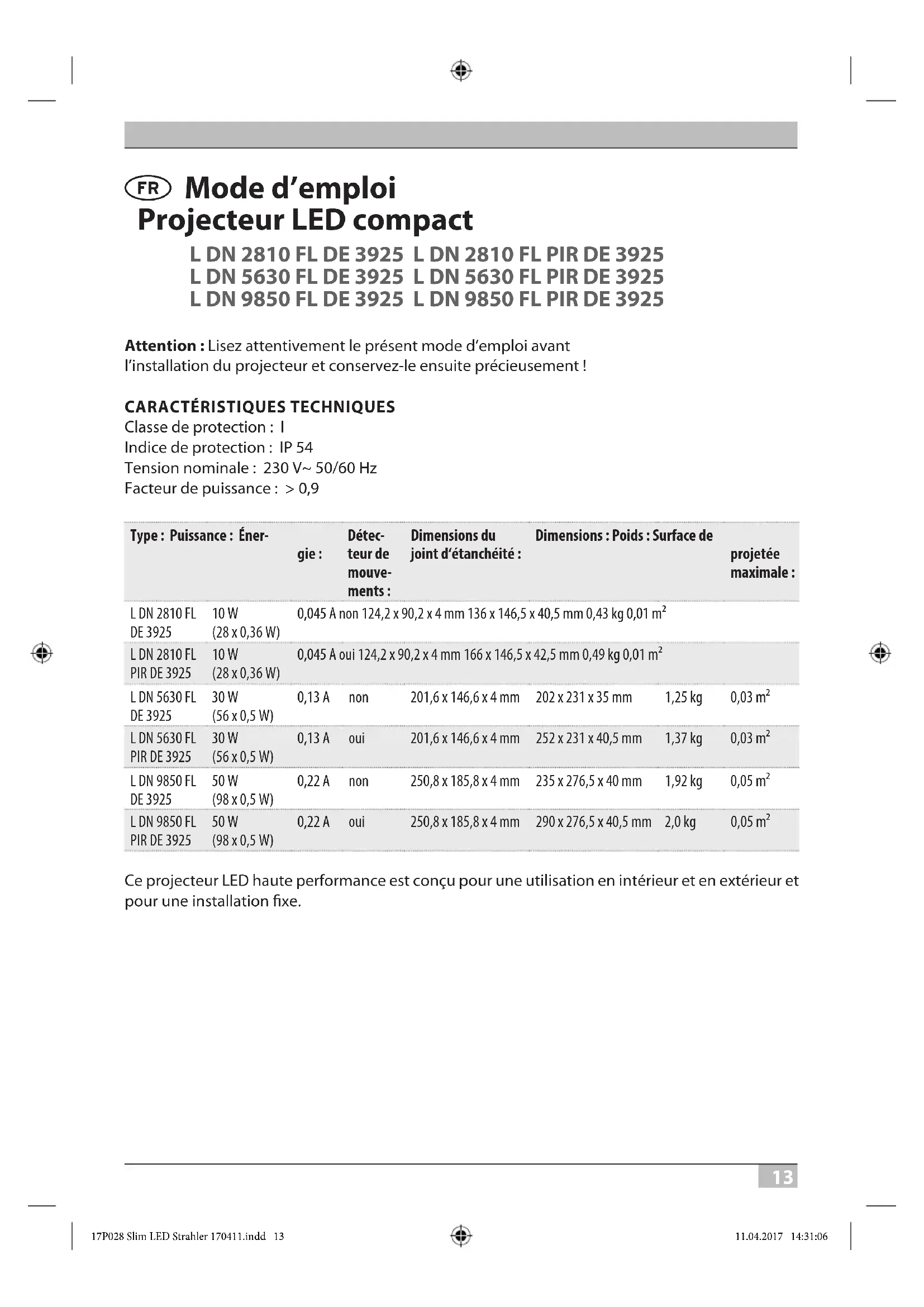 Classe de protection : I Indice de protection : IP 54 Tension nominale : 230 V~ 50/60 Hz Facteur de puissance : > 0,9 Type : Puissance : Éner- gie : Détec- teur de mouve- ments : Dimensions du joint d‘étanchéité : Dimensions : Poids : Surface de projetée maximale : L DN 2810 FL DE 3925 10 W (28 x 0,36 W) 0,045 A non 124,2 x 90,2 x 4 mm 136 x 146,5 x 40,5 mm 0,43 kg 0,01 m² L DN 2810 FL PIR DE 3925 10 W (28 x 0,36 W) 0,045 A oui 124,2 x 90,2 x 4 mm 166 x 146,5 x 42,5 mm 0,49 kg 0,01 m² L DN 5630 FL DE 3925 30 W (56 x 0,5 W) 0,13 A non 201,6 x 146,6 x 4 mm 202 x 231 x 35 mm 1,25 kg 0,03 m² L DN 5630 FL PIR DE 3925 30 W (56 x 0,5 W) 0,13 A oui 201,6 x 146,6 x 4 mm 252 x 231 x 40,5 mm 1,37 kg 0,03 m² L DN 9850 FL DE 3925 50 W (98 x 0,5 W) 0,22 A non 250,8 x 185,8 x 4 mm 235 x 276,5 x 40 mm 1,92 kg 0,05 m² L DN 9850 FL PIR DE 3925 50 W (98 x 0,5 W) 0,22 A oui 250,8 x 185,8 x 4 mm 290 x 276,5 x 40,5 mm 2,0 kg 0,05 m² Ce projecteur LED haute performance est conçu pour une utilisation en intérieur et en extérieur et pour une installation xe. 17P028 Slim LED Strahler 170411.indd 13 11.04.2017 14:31:0614