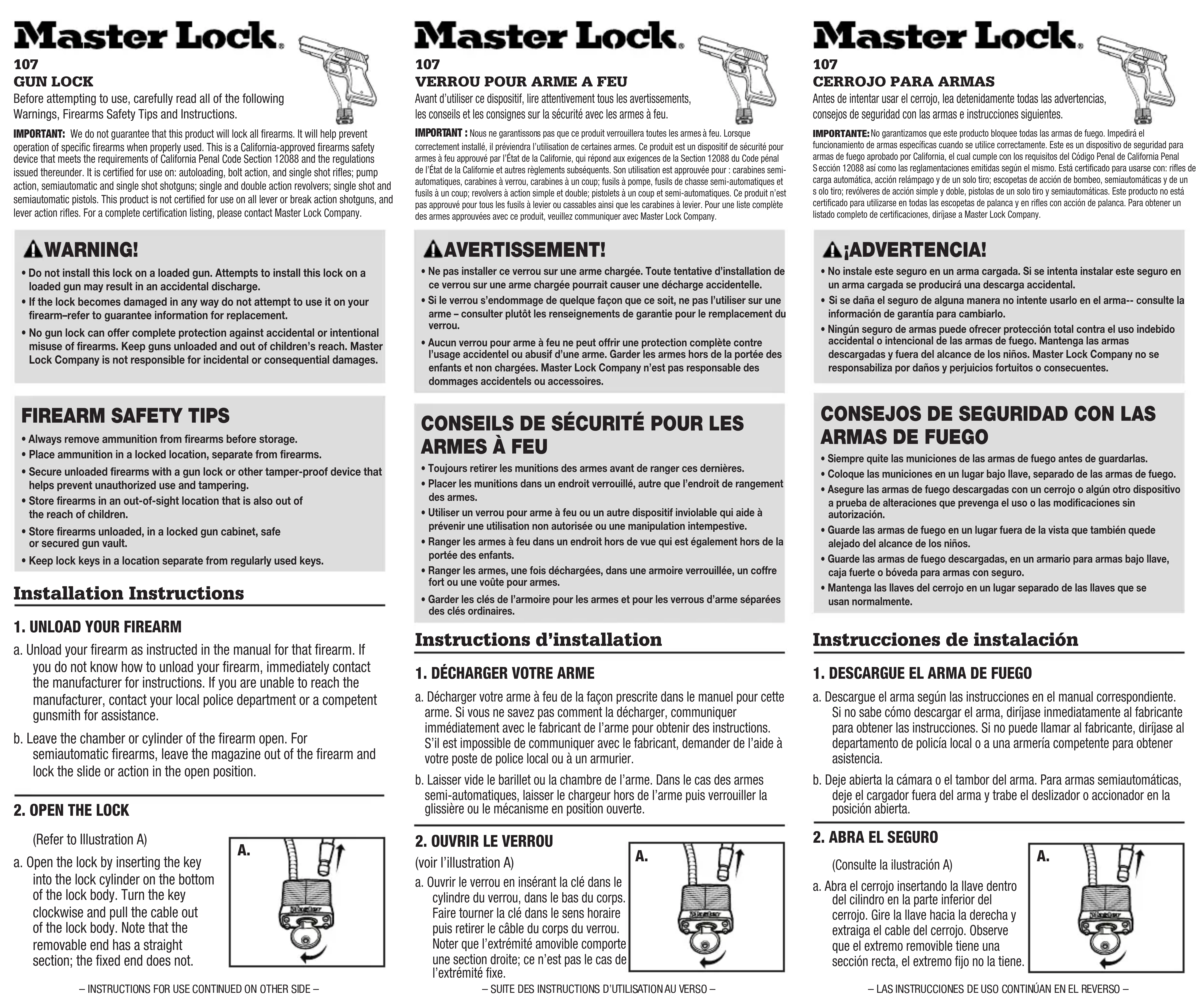 IMPORTANT : Nous ne garantissions pas que ce produit verrouillera toutes les armes à feu. Lorsque correctement installé, il préviendra l'utilisation de certaines armes. Ce produit est un dispositif de sécurité pour armes à feu approuvée par l'Etat de la Californie, qui rendox exigences de la Seite 12088 du Code pénal de l'Etat de la Californie et autres règlements subsèquents. Son utilisation est approvée pour: carabines semi-automatiques, carabines à verru, carabines à un coup; fusils à pompé, fusils de chasse semi-automatiques et fusils à un coup; revolvers à action simple et double; pistolets à un coup et semi-automatiques. Ce produit n'est pas approvée pour tous les fusils à lever ou cassables ainsi que les carabines à lever. Pour une liste complète des armes appliquées avec ce produit, visqueau communier avec Master Lock Company.