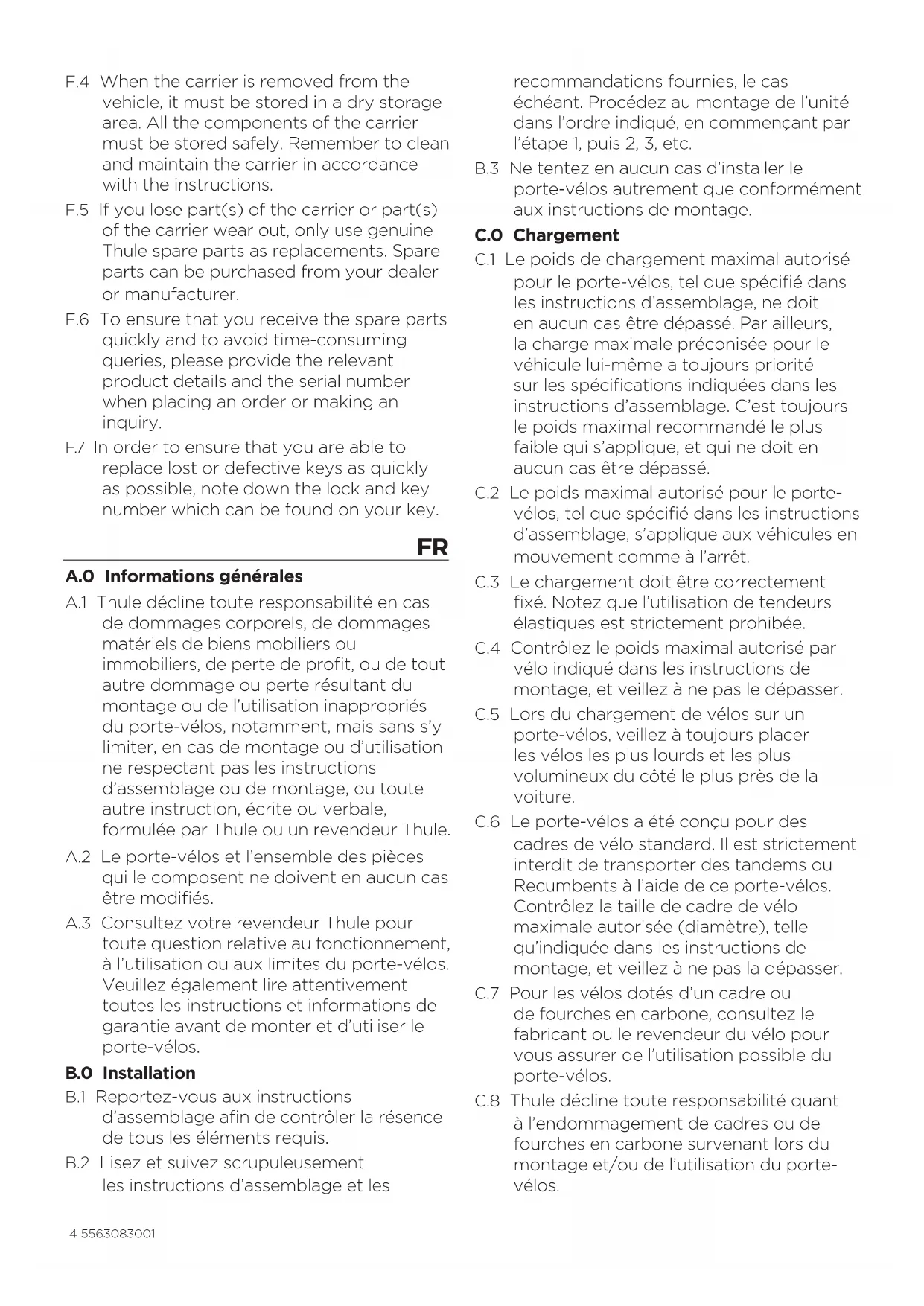 A.0 Informations générales A.1 Thule décline toute responsabilité en cas de dommages corporels, de dommages matériels de biens mobiliers ou immobiliers, de perte de profit, ou de tout autre dommage ou perte résultant du montage ou de l’utilisation inappropriés du porte-vélos, notamment, mais sans s’y limiter, en cas de montage ou d’utilisation ne respectant pas les instructions d’assemblage ou de montage, ou toute autre instruction, écrite ou verbale, formulée par Thule ou un revendeur Thule. A.2 Le porte-vélos et l’ensemble des pièces qui le composent ne doivent en aucun cas être modifiés. A.3 Consultez votre revendeur Thule pour toute question relative au fonctionnement, à l’utilisation ou aux limites du porte-vélos. Veuillez également lire attentivement toutes les instructions et informations de garantie avant de monter et d’utiliser le porte-vélos. B.0 Installation B.1 Reportez-vous aux instructions d’assemblage afin de contrôler la résence de tous les éléments requis. B.2 Lisez et suivez scrupuleusement les instructions d’assemblage et les recommandations fournies, le cas échéant. Procédez au montage de l’unité dans l’ordre indiqué, en commençant par l’étape 1, puis 2, 3, etc. B.3 Ne tentez en aucun cas d’installer le porte-vélos autrement que conformément aux instructions de montage. C.0 Chargement C.1 Le poids de chargement maximal autorisé pour le porte-vélos, tel que spécifié dans les instructions d’assemblage, ne doit en aucun cas être dépassé. Par ailleurs, la charge maximale préconisée pour le véhicule lui-même a toujours priorité sur les spécifications indiquées dans les instructions d’assemblage. C’est toujours le poids maximal recommandé le plus faible qui s’applique, et qui ne doit en aucun cas être dépassé. C.2 Le poids maximal autorisé pour le porte- vélos, tel que spécifié dans les instructions d’assemblage, s’applique aux véhicules en mouvement comme à l’arrêt. C.3 Le chargement doit être correctement fixé. Notez que l’utilisation de tendeurs élastiques est strictement prohibée. C.4 Contrôlez le poids maximal autorisé par vélo indiqué dans les instructions de montage, et veillez à ne pas le dépasser. C.5 Lors du chargement de vélos sur un porte-vélos, veillez à toujours placer les vélos les plus lourds et les plus volumineux du côté le plus près de la voiture. C.6 Le porte-vélos a été conçu pour des cadres de vélo standard. Il est strictement interdit de transporter des tandems ou Recumbents à l’aide de ce porte-vélos. Contrôlez la taille de cadre de vélo maximale autorisée (diamètre), telle qu’indiquée dans les instructions de montage, et veillez à ne pas la dépasser. C.7 Pour les vélos dotés d’un cadre ou de fourches en carbone, consultez le fabricant ou le revendeur du vélo pour vous assurer de l’utilisation possible du porte-vélos. C.8 Thule décline toute responsabilité quant à l’endommagement de cadres ou de fourches en carbone survenant lors du montage et/ou de l’utilisation du porte- vélos.55563083001C.9 Tous les éléments pouvant être facilement démontés doivent être retirés du vélo avant le transport, notamment le siège enfant, panier, antivol (non fixes) ou pompe à air. Cette liste est non exhaustive. Ces éléments pourraient en eet se détacher lors du transport en raison de l’augmentation des vibrations et de la résistance à l’air, et constituer un danger pour les autres usagers de la route. C.10 Si le véhicule est équipé d’une fonction d’ouverture automatique du core ou du hayon arrière, celle-ci doit impérativement être désactivée : le compartiment à bagages doit être ouvert manuellement en cas d’utilisation d’un porte-vélos sur hayon arrière, afin de ne pas endommager le véhicule et/ou le porte-vélos. C.11 Si nécessaire, le chargement doit être complété avec les feux et signes d’avertissement appropriés, conformément à la législation locale en vigueur. C.12 Conservez les instructions de montage ainsi que les consignes de sécurité dans le véhicule équipé du porte-vélos. C.13 Ne l’installez pas sur une remorque ou un véhicule remorqué. D.0 Informations importantes relatives aux porte-vélos avec fixation sur récepteurs d’attelage D.1 Le porte-vélos ne doit être monté que sur des récepteurs d’attelage avec une position de pin-hole conformément aux instructions de montage. D.2 Le poids combiné du porte-vélos et du chargement ne doit en aucun cas dépasser la capacité de charge autorisée sur le récepteur d’attelage. D.3 Vérifiez toujours que le récepteur d’attelage est exempte de saleté et qu’elle est en bon état. D.4 Veillez à contrôler le bon fonctionnement de l’ensemble des feux avant tout trajet. D.5 Le porte-vélos doit être fréquemment resserré conformément aux instructions de montage. Si le porte-vélos se déplace au niveau du récepteur d’attelage ou que la force de serrage est réduite lors de l’utilisation de la poignée de fixation, cette force doit être ajustée conformément aux instructions de montage. D.6 Si le porte-vélos est équipé d’un mécanisme d’inclinaison permettant un accès aisé au core, assurez-vous que ce mécanisme est correctement verrouillé en position de transport avant tout trajet. D.7 Maintenez une distance de sécurité entre l’ensemble porte-vélos/vélos et le pot d’échappement, afin d’éviter tout dommage provoqués par la chaleur. Un pot d’échappement et/ou des gaz d’échappement chauds peuvent en eet endommager les composants du porte- vélos et/ou les vélos. E.0 Réglementation et caractéristiques de conduite E.1 Ce produit n’a pas été approuvé et ne doit pas être utilisé pour la conduite tout-terrain. Adaptez votre vitesse aux conditions de route et au chargement transporté. Contrôlez régulièrement la fixation du chargement. E.2 Il est de la s