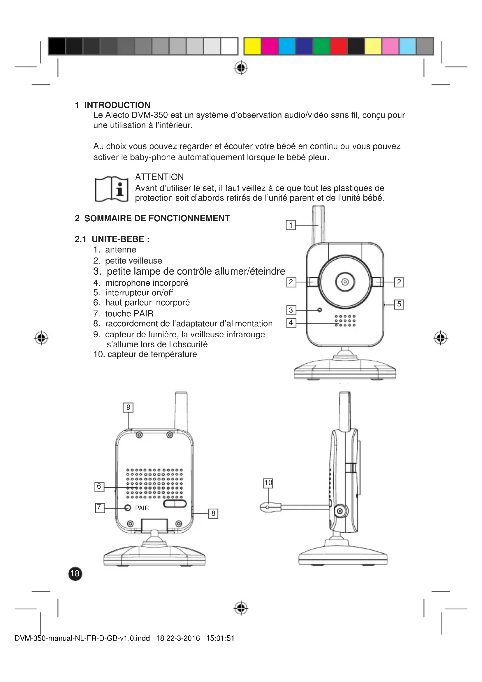 8 SPECIFICATIONS ................................................................................... 30 9 GARANTIE .............................................................................................. 30 DVM-350-manual-NL-FR-D-GB-v1.0.indd 17 22-3-2016 15:01:5118 1 INTRODUCTION Le Alecto DVM-350 est un système d’observation audio/vidéo sans l, conçu pour une utilisation à l’intérieur. Au choix vous pouvez regarder et écouter votre bébé en continu ou vous pouvez activer le baby-phone automatiquement lorsque le bébé pleur. ATTENTION Avant d’utiliser le set, il faut veillez à ce que tout les plastiques de protection soit d’abords retirés de l’unité parent et de l’unité bébé.