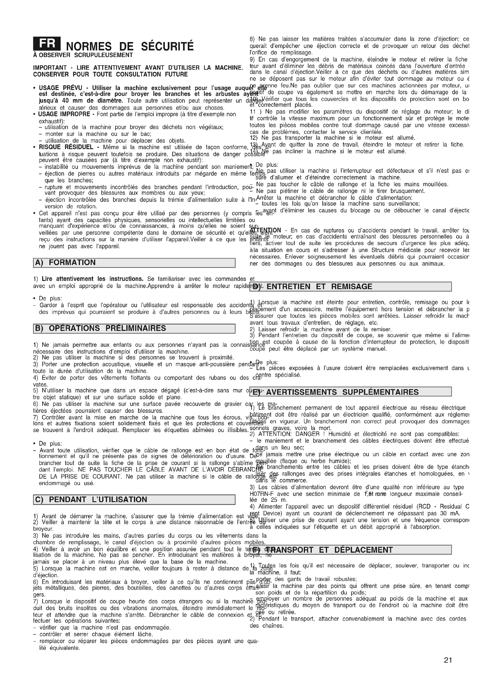 USAGE PRÉVU - Utiliser la machine exclusivement pour l’usage auquel elle est destinée, c’est-à-dire pour broyer les branches et les arbustes ayant