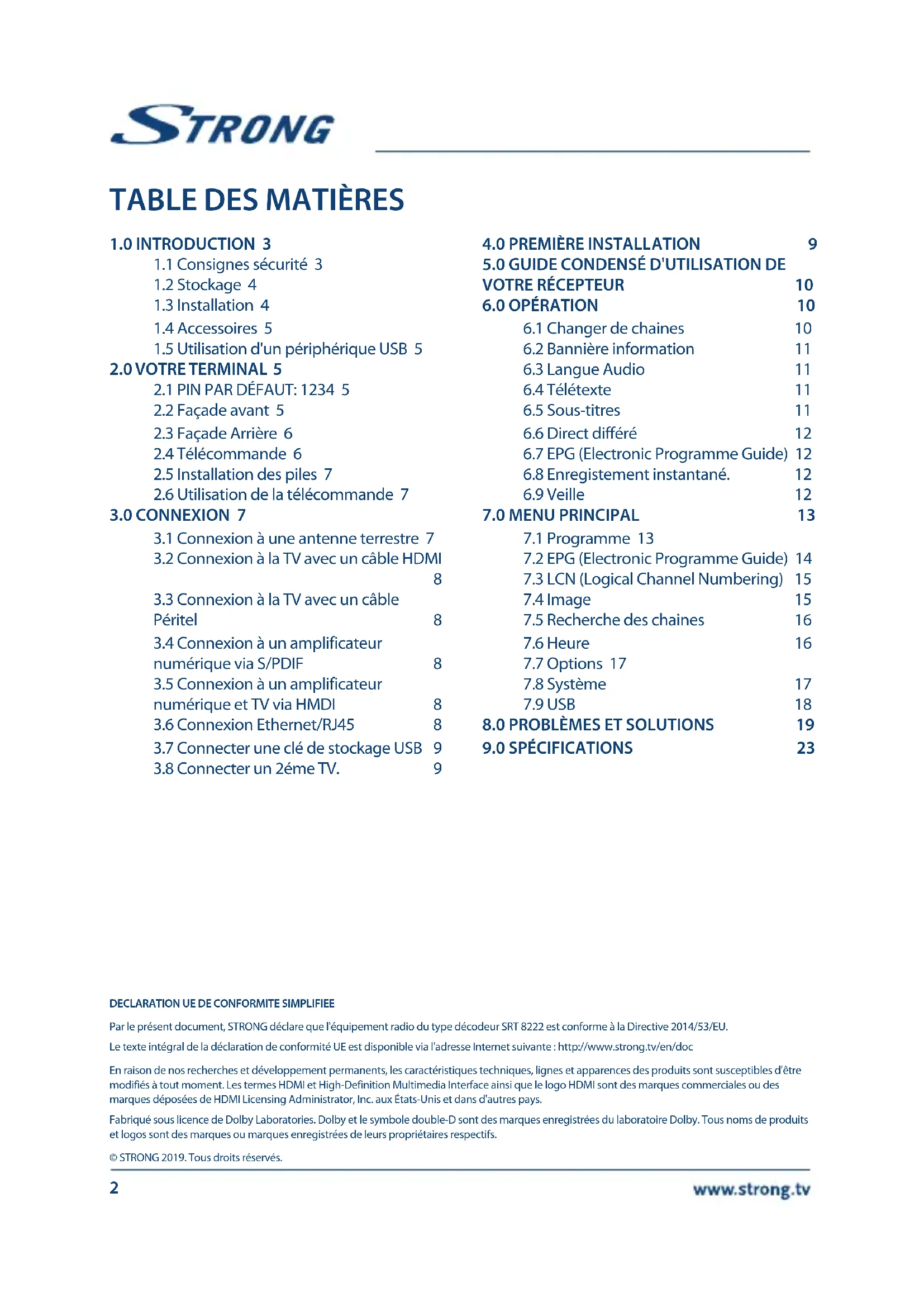 Par le présent document, STRONG déclare que l'équipement radio du type décodeur SRT 8222 est conforme à la Directive 2014/53/EU. Le texte intégral de la déclaration de conformité UE est disponible via l'adresse Internet suivante : http://www.strong.tv/en/doc En raison de nos recherches et développement permanents, les caractéristiques techniques, lignes et apparences des produits sont susceptibles d'être modifiés à tout moment. Les termes HDMI et High-Definition Multimedia Interface ainsi que le logo HDMI sont des marques commerciales ou des marques déposées de HDMI Licensing Administrator, Inc. aux États-Unis et dans d'autres pays. Fabriqué sous licence de Dolby Laboratories. Dolby et le symbole double-D sont des marques enregistrées du laboratoire Dolby. Tous noms de produits et logos sont des marques ou marques enregistrées de leurs propriétaires respectifs. © STRONG 2019. Tous droits réservés.