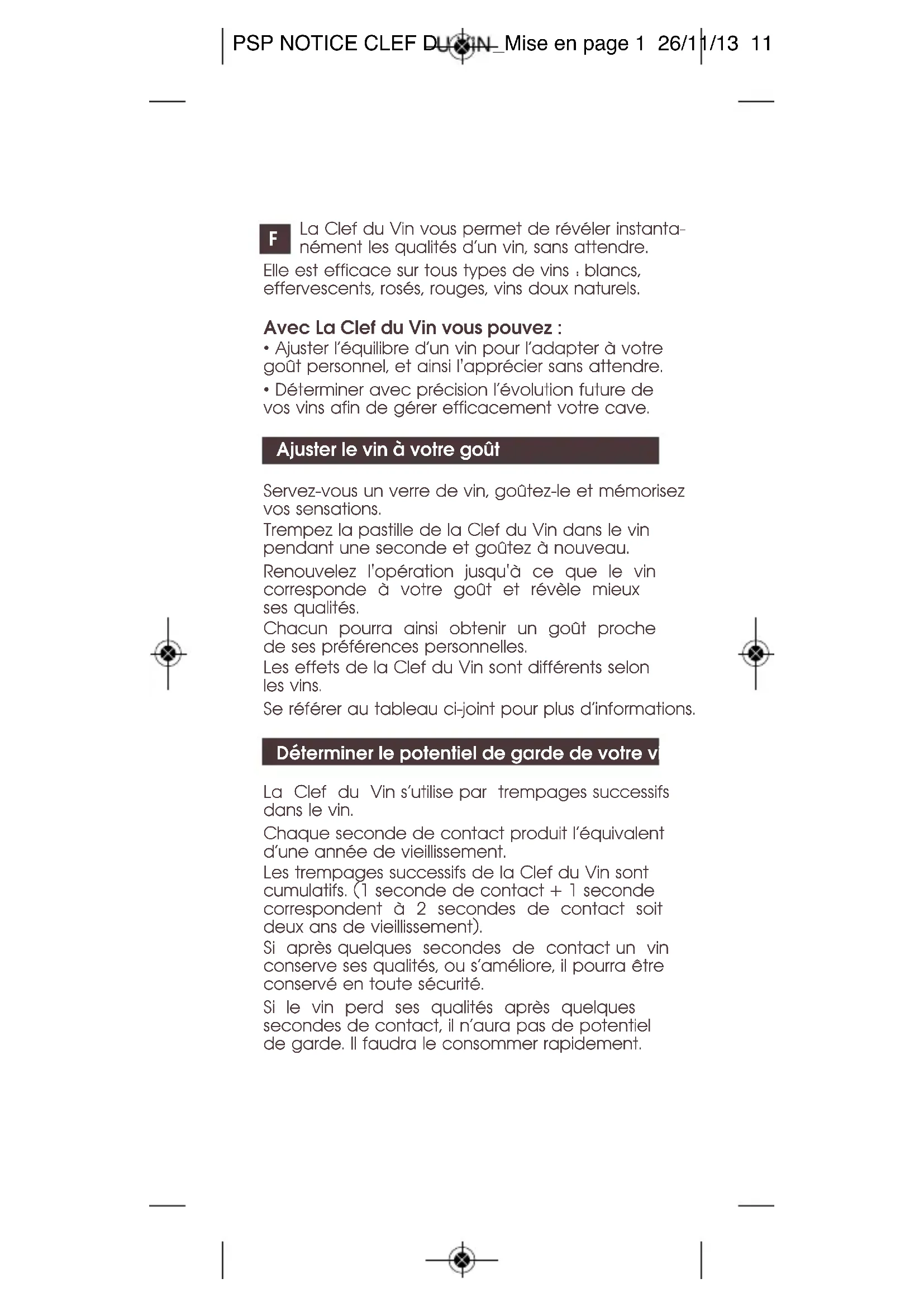 PSP NOTICE CLEF DU VIN_Mise en page 1 26/11/13 11Attention : certains vins sont excellents très jeunes, d’autres doivent mûrir longuement. La Clef du Vin permet de déterminer l’apogée, c'est-à-dire le moment où le vin sera au meilleur de lui-même. Cette apogée variera en fonction des vins, des cépages, des millésimes, mais également de votre goût personnel. La Clef du Vin n’aura aucune action bénéfique sur un vin de mauvaise qualité. Nettoyage : rincer simplement la Clef du Vin à l’eau chaude. Pas d’utilisation au lave-vaisselle. Explications techniques : Durant son vieillissement en bouteille, le vin suit un processus naturel d’oxydoréduction. Il mûrit, atteignant peu à peu une période d’équilibre où il s’apprécie à son maximum (l’apogée), puis décline en perdant ses qualités. La Clef du Vin permet d’accélérer cette évolution en reproduisant le mécanisme de l’oxydoréduction de façon contrôlée, régulée. Agissant comme un catalyseur, elle ne communique aucune substance au vin et ne s’use pas. Son efficacité est garantie à vie. 1 s/1 an …… 5 s/5 ans …… 10 s/10 ans …… PSP NOTICE CLEF DU VIN_Mise en page 1 26/11/13 11Ex Cabernet Sauvignon Merlot Malbec Tannat