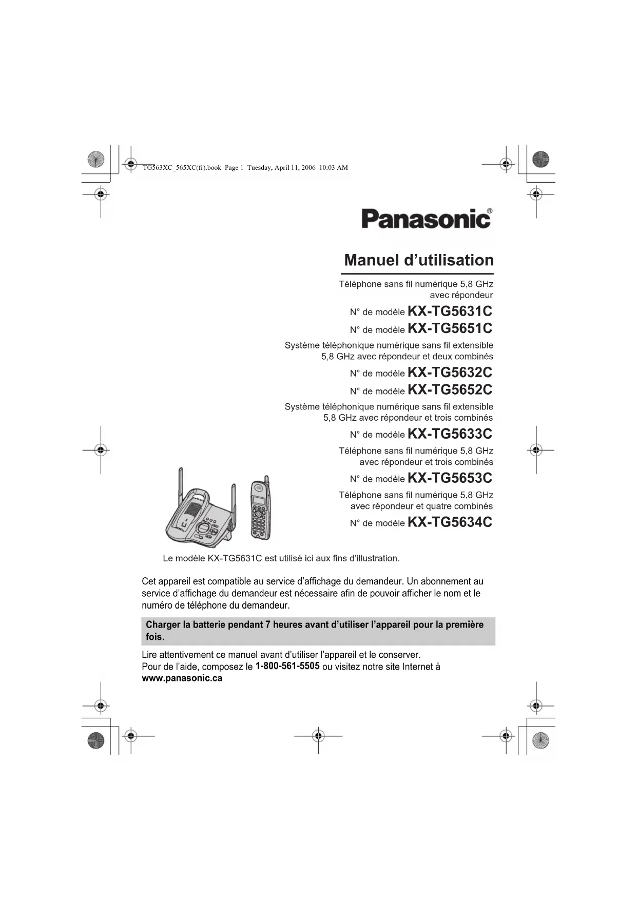 Cet appareil est compatible au service d’affichage du demandeur. Un abonnement au service d’affichage du demandeur est nécessaire afin de pouvoir afficher le nom et le numéro de téléphone du demandeur. Lire attentivement ce manuel avant d’utiliser l’appareil et le conserver. Pour de l’aide, composez le 1-800-561-5505 ou visitez notre site Internet à www.panasonic.ca Charger la batterie pendant 7 heures avant d’utiliser l’appareil pour la première fois. Manuel d’utilisation Téléphone sans fil numérique 5,8 GHz avec répondeur N° de modèle KX-TG5631C N° de modèle KX-TG5651C Système téléphonique numérique sans fil extensible 5,8 GHz avec répondeur et deux combinés N° de modèle KX-TG5632C N° de modèle KX-TG5652C Système téléphonique numérique sans fil extensible 5,8 GHz avec répondeur et trois combinés N° de modèle KX-TG5633C Téléphone sans fil numérique 5,8 GHz avec répondeur et trois combinés N° de modèle KX-TG5653C Téléphone sans fil numérique 5,8 GHz avec répondeur et quatre combinés N° de modèle KX-TG5634C Le modèle KX-TG5631C est utilisé ici aux fins d’illustration. TG563XC_565XC(fr).book Page 1 Tuesday, April 11, 2006 10:03 AMSommaire