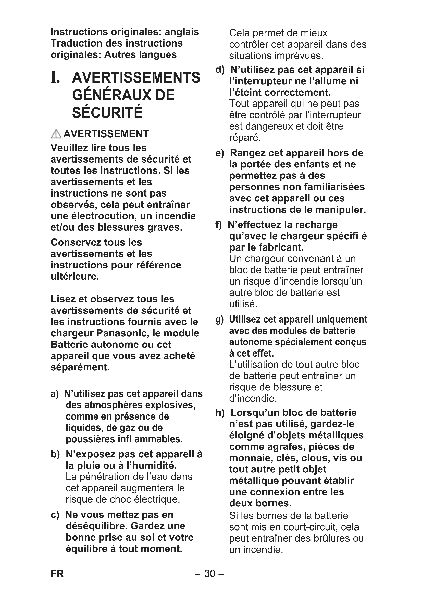 SÉCURITÉ AVERTISSEMENT Veuillez lire tous les avertissements de sécurité et toutes les instructions. Si les avertissements et les instructions ne sont pas observés, cela peut entraîner une électrocution, un incendie et/ou des blessures graves. Conservez tous les avertissements et les instructions pour référence ultérieure. Lisez et observez tous les avertissements de sécurité et les instructions fournis avec le chargeur Panasonic, le module Batterie autonome ou cet appareil que vous avez acheté séparément. a) N’utilisez pas cet appareil dans des atmosphères explosives, comme en présence de liquides, de gaz ou de poussières infl ammables. b) N’exposez pas cet appareil à la pluie ou à l’humidité. La pénétration de l’eau dans cet appareil augmentera le risque de choc électrique. c) Ne vous mettez pas en déséquilibre. Gardez une bonne prise au sol et votre équilibre à tout moment. Cela permet de mieux contrôler cet appareil dans des situations imprévues. d) N’utilisez pas cet appareil si l’interrupteur ne l’allume ni l’éteint correctement. Tout appareil qui ne peut pas être contrôlé par l’interrupteur est dangereux et doit être réparé. e) Rangez cet appareil hors de la portée des enfants et ne permettez pas à des personnes non familiarisées avec cet appareil ou ces instructions de le manipuler. f) N’effectuez la recharge qu’avec le chargeur spécifi é par le fabricant. Un chargeur convenant à un bloc de batterie peut entraîner un risque d’incendie lorsqu’un autre bloc de batterie est utilisé. g) Utilisez cet appareil uniquement avec des modules de batterie autonome spécialement conçus à cet effet. L’utilisation de tout autre bloc de batterie peut entraîner un risque de blessure et d’incendie. h) Lorsqu’un bloc de batterie n’est pas utilisé, gardez-le éloigné d’objets métalliques comme agrafes, pièces de monnaie, clés, clous, vis ou tout autre petit objet métallique pouvant établir une connexion entre les deux bornes. Si les bornes de la batterie sont mis en court-circuit, cela peut entraîner des brûlures ou un incendie. EY971037C401.indb30EY971037C401.indb30 2019/08/2320:52:342019/08/2320:52:34-