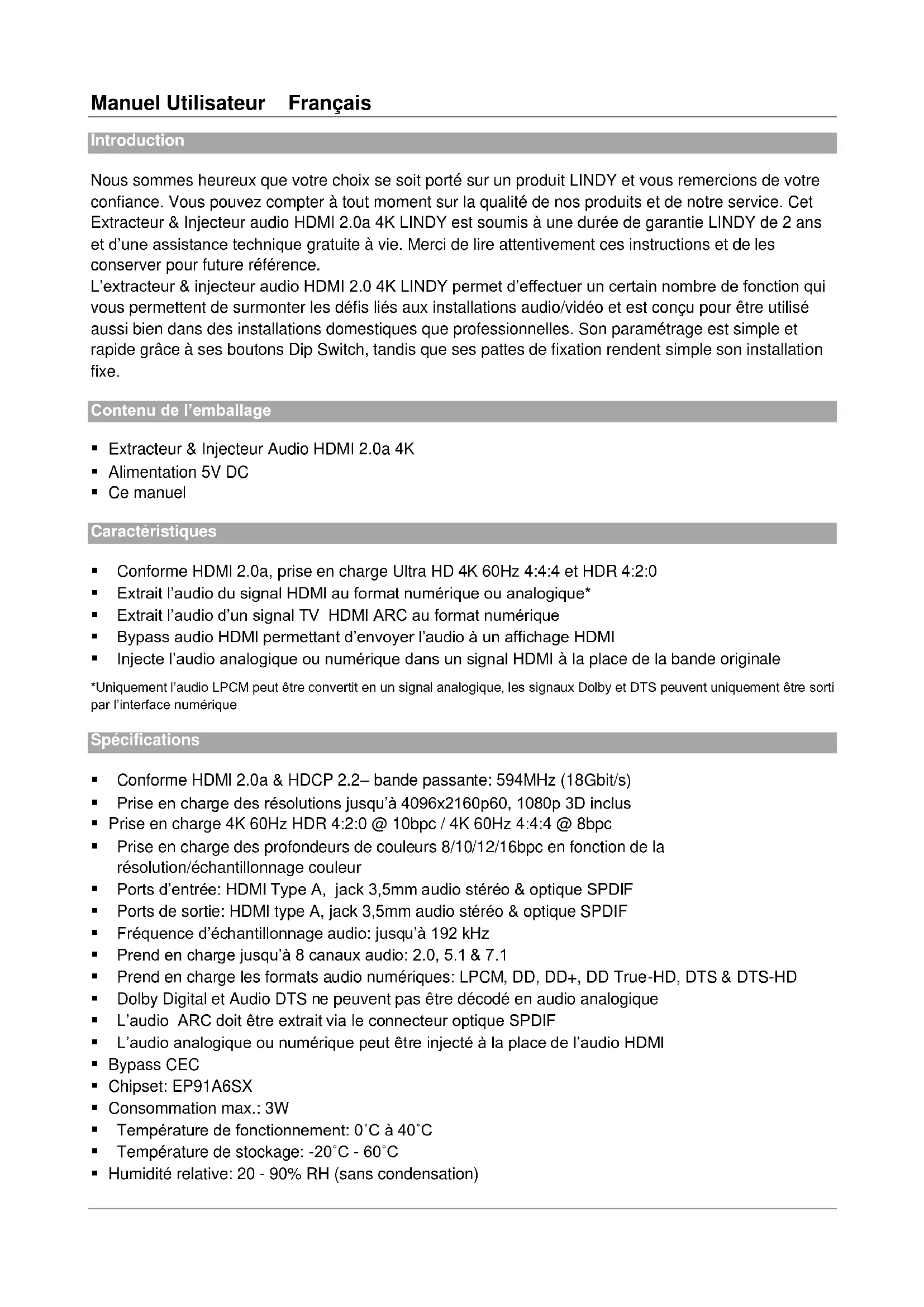 DIP-Schalter Position Description 2-Pin PIN #1 ON [] Audio Einbettungs-Funktion EIN OFF [] Audio Einbettungs-Funktion AUS PIN #2 ON [] Audio Einbettung des Toslink Signals OFF [] Audio Einbettung des 3.5mm Stereosignals DIP-Schalter Position Description 4-Pin PIN #1 ON [] Audio Extraktor-Funktion (via Toslink & 3.5mm) EIN OFF [] Audio Extraktor-Funktion AUS PIN #2 ON [] ARC Funktion EIN *siehe Hinweis OFF [] ARC Funktion AUS PIN #3 ON [] Ohne Funktion OFF [] Ohne Funktion PIN #4 ON [] Firmware Update Modus OFF [] Normaler BetriebsmodusManuel Utilisateur Français Introduction Nous sommes heureux que votre choix se soit porté sur un produit LINDY et vous remercions de votre confiance. Vous pouvez compter à tout moment sur la qualité de nos produits et de notre service. Cet Extracteur & Injecteur audio HDMI 2.0a 4K LINDY est soumis à une durée de garantie LINDY de 2 ans et d’une assistance technique gratuite à vie. Merci de lire attentivement ces instructions et de les conserver pour future référence. L’extracteur & injecteur audio HDMI 2.0 4K LINDY permet d’effectuer un certain nombre de fonction qui vous permettent de surmonter les défis liés aux installations audio/vidéo et est conçu pour être utilisé aussi bien dans des installations domestiques que professionnelles. Son paramétrage est simple et rapide grâce à ses boutons Dip Switch, tandis que ses pattes de fixation rendent simple son installation fixe. Contenu de l’emballage Extracteur & Injecteur Audio HDMI 2.0a 4K Alimentation 5V DC Ce manuel Caractéristiques Conforme HDMI 2.0a, prise en charge Ultra HD 4K 60Hz 4:4:4 et HDR 4:2:0 Extrait l’audio du signal HDMI au format numérique ou analogique* Extrait l’audio d’un signal TV HDMI ARC au format numérique Bypass audio HDMI permettant d’envoyer l’audio à un affichage HDMI Injecte l’audio analogique ou numérique dans un signal HDMI à la place de la bande originale *Uniquement l’audio LPCM peut être convertit en un signal analogique, les signaux Dolby et DTS peuvent uniquement être sorti par l’interface numérique Spécifications Conforme HDMI 2.0a & HDCP 2.2– bande passante: 594MHz (18Gbit/s) Prise en charge des résolutions jusqu’à 4096x2160p60, 1080p 3D inclus Prise en charge 4K 60Hz HDR 4:2:0 @ 10bpc / 4K 60Hz 4:4:4 @ 8bpc Prise en charge des profondeurs de couleurs 8/10/12/16bpc en fonction de la résolution/échantillonnage couleur Ports d’entrée: HDMI Type A, jack 3,5mm audio stéréo & optique SPDIF Ports de sortie: HDMI type A, jack 3,5mm audio stéréo & optique SPDIF Fréquence d’échantillonnage audio: jusqu’à 192 kHz Prend en charge jusqu’à 8 canaux audio: 2.0, 5.1 & 7.1 Prend en charge les formats audio numériques: LPCM, DD, DD+, DD True-HD, DTS & DTS-HD Dolby Digital et Audio DTS ne peuvent pas être décodé en audio analogique L’audio ARC doit être extrait via le connecteur optique SPDIF L’audio analogique ou numérique peut être injecté à la place de l’audio HDMI Bypass CEC Chipset: EP91A6SX Consommation max.: 3W Température de fonctionnement: 0˚C à 40˚C Température de stockage: -20˚C - 60˚C Humidité relative: 20 - 90% RH (sans condensation)Manuel Utilisateur Français Panneau avant