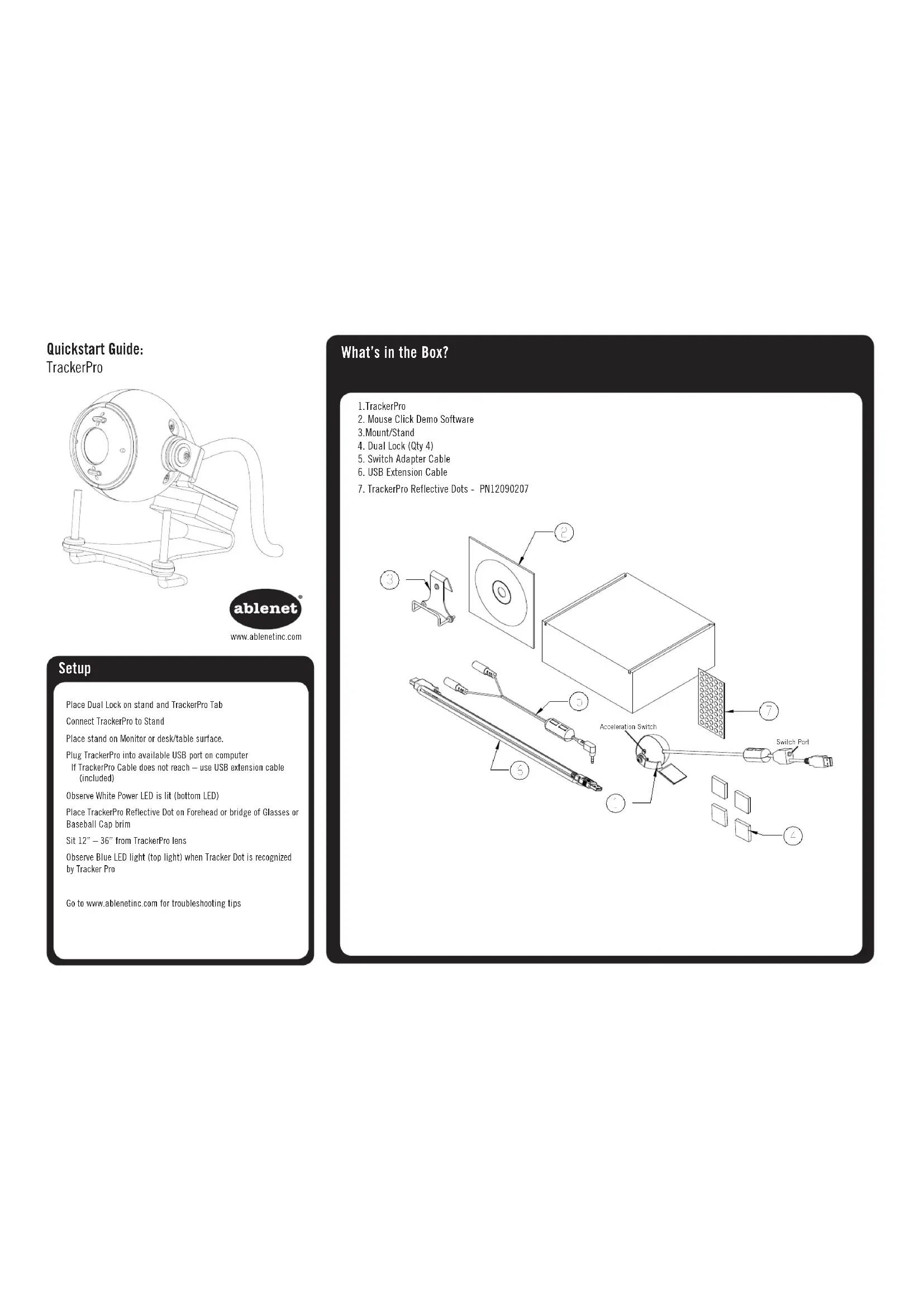 www.ablenetinc.com Configuration Positionnez le double verrouillage sur le support et la languette du TrackerPro Fixez le TrackerPro au support Positionnez le support sur un écran ou la surface d'une table/bureau. Raccordez le TrackerPro dans un port USB disponible de l'ordinateur Si le câble du TrackerPro est trop court, utilisez le câble d'extension USB (fournit) Notez que la DEL d'alimentation blanche est allumée (DEL du bas) Placez les Points réfléchissant du TrackerPro sur le front ou le pont de lunettes ou sur le bord d'une casquette de baseball Asseyez-vous entre 0,3 et 1m de l'objectif du TrackerPro Notez la DEL bleue (DEL du haut) lorsque le Point du Tracker est reconnu par le TrackerPro Allez sur le site www.ablenetinc.com pour les conseils de dépannage Port du commutateur Commutateur d'accélérationOptions de clics souris Montage sur un bureau Option 1 – Contrôlé par le logiciel L'installation comprend le logiciel de commande de clic de souris en version de démonstration Option 2 – Utilisation du commutateur Commutateur double – Branchez directement dans le port du commutateur sur le TrackerPro Commutateur simple – Branchez le câble d'adaptation pour commutateur dans le port du commutateur sur le TrackerPro Branchez le(s) commutateur(s) dans les prises jack du câble d'adaptation pour commutateur. La prise jack blanche est pour le clic gauche La prise jack rouge est pour le clic droit Montage sur un écran Astuces et garantie Dimensions : 2po x 2po x 3.25po (5,08cm x 5,08cm x 8,25cm) Poids : 0,25lb (0,11kg) Tension d'entrée: 5V par le port USB Puissance: 1,15watts Champ de vision: 45 °, symétrique Objectif: Focale fixe Température de fonctionnement : 0 - 40 °C, 32 - 105 °F Transmission par infrarouge: 850nanomètres Entrée de commutateur: jack stéréo de 3,5mm Utilise les pilotes HID USB standards – fonctionne sous Windows, Mac et Linux Astuce: si le curseur est lent, déplacez le commutateur d'accélération sur la position «On» (marche) Garantie Les produits AbleNet sont assortis d’une garantie limitée de deux ans. Cette garantie protège contre les défauts de matériel et les vices de fabrication pendant deux ans à partir de la date d’achat. La garantie en version texte complète texte et toutes les informations sur les réparations et les retours sont disponibles à www.ablenetinc.com. Pour obtenir de plus amples renseignements sur les produits et services d’AbleNet, contactez: AbleNet, Inc. Minneapolis/St. Paul, MN | 800-322-0956 | www.ablenetinc.com PN 98000037 FN 70500193C (07/18)Packungsinhalt Kurzanleitung: TrackerPro