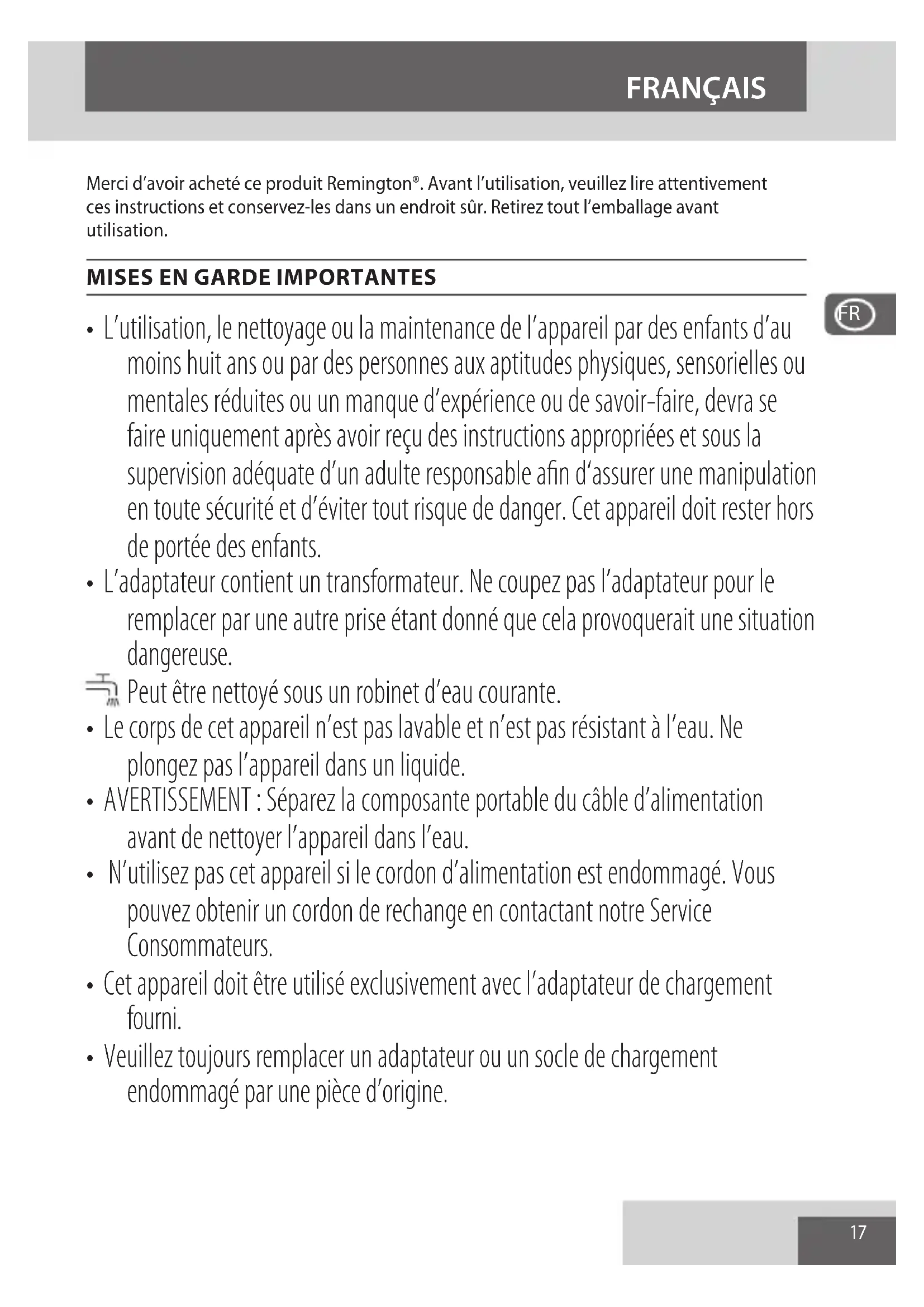 An d’éviter les problèmes occasionnés à l’environnement et à la santé par des substances dangereuses, les appareils et les batteries rechargeables et non rechargeables présentant l’un de ces symboles ne doivent pas être éliminés avec les déchets municipaux non triés. Éliminez dans tous les cas les produits électriques et électroniques et, le cas échéant, les batteries rechargeables et non rechargeables, dans un centre ociel et approprié de collecte/recyclage.22 Gracias por comprar nuestro nuevo producto Remington®. Lea detenidamente las instrucciones y guárdelas en un lugar seguro. Retire todo el embalaje antes de usar el producto.