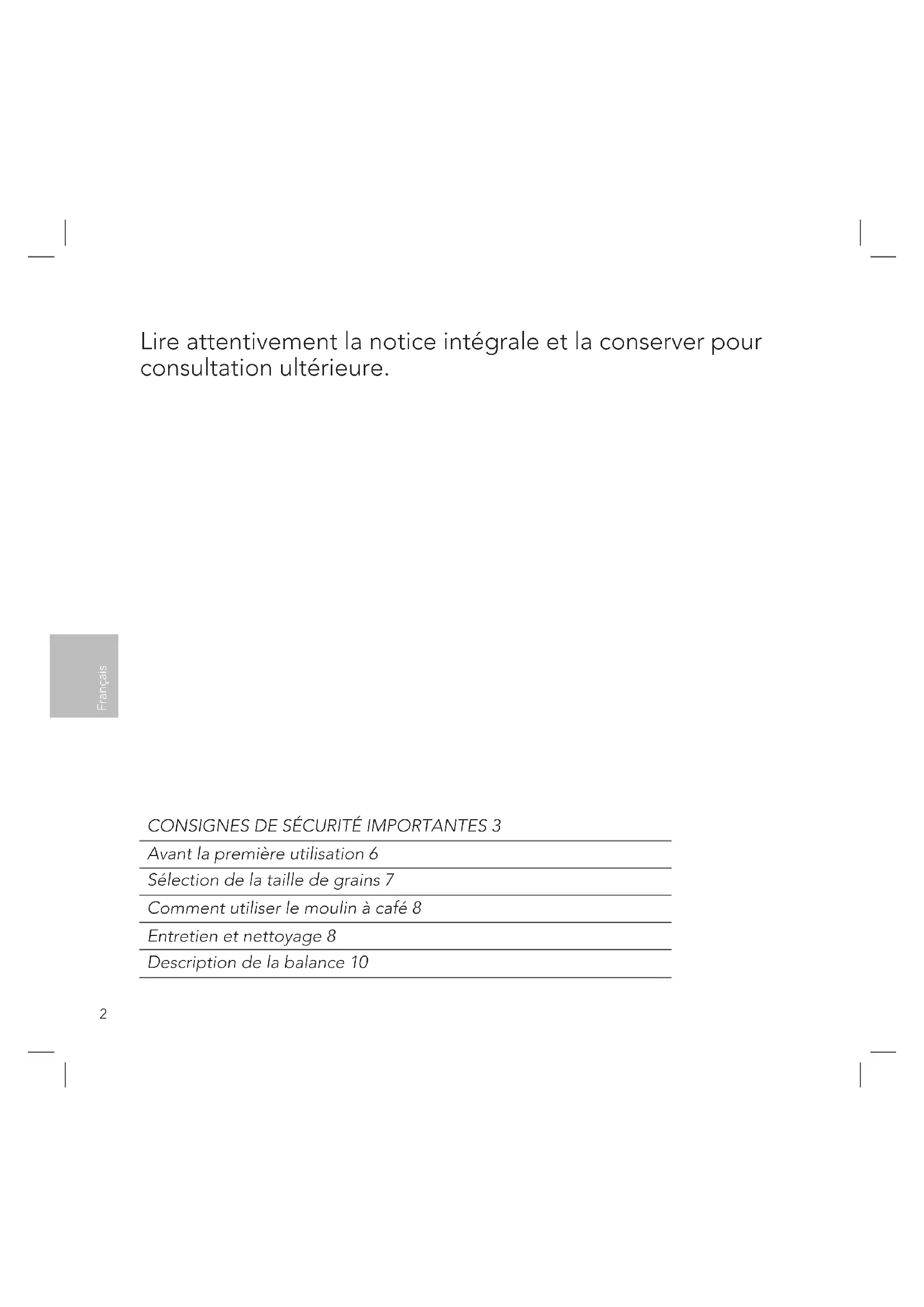 Avant la première utilisation 6 Sélection de la taille de grains 7 Comment utiliser le moulin à café 8 Entretien et nettoyage 8 Description de la balance 103 Français DanskDansk Français Français Consignes de sécurité importantes