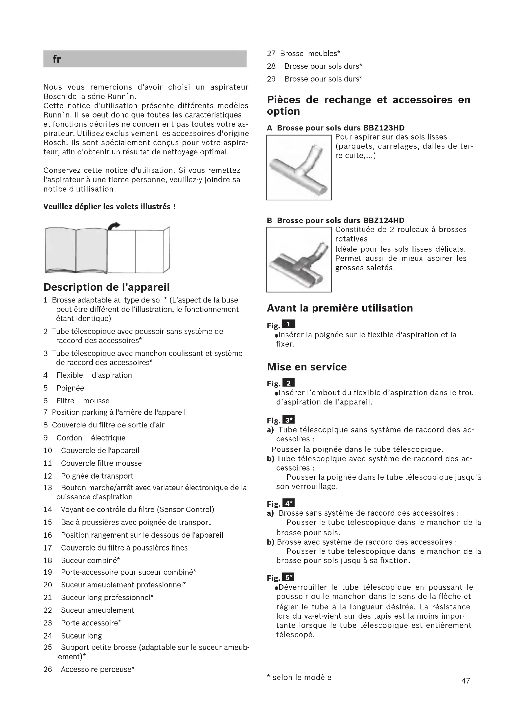 - selon le modèle Nous vous remercions d'avoir choisi un aspirateur Bosch de la série Runn`n. Cette notice d'utilisation présente différents modèles Runn`n. Il se peut donc que toutes les caractéristiques et fonctions décrites ne concernent pas toutes votre as- pirateur. Utilisez exclusivement les accessoires d'origine Bosch. Ils sont spécialement conçus pour votre aspira- teur, afin d'obtenir un résultat de nettoyage optimal. Conservez cette notice d'utilisation. Si vous remettez l'aspirateur à une tierce personne, veuillez-y joindre sa notice d'utilisation. Veuillez déplier les volets illustrés ! Description de l'appareil 1 Brosse adaptable au type de sol * (L'aspect de la buse peut être différent de l'illustration, le fonctionnement étant identique) 2 Tube télescopique avec poussoir sans système de raccord des accessoires* 3 Tube télescopique avec manchon coulissant et système de raccord des accessoires* 4 Flexible d'aspiration 5 Poignée 6 Filtre mousse 7 Position parking à l'arrière de l'appareil 8 Couvercle du filtre de sortie d'air 9 Cordon électrique 10 Couvercle de l'appareil 11 Couvercle filtre mousse 12 Poignée de transport 13 Bouton marche/arrêt avec variateur électronique de la puissance d'aspiration 14 Voyant de contrôle du filtre (Sensor Control) 15 Bac à poussières avec poignée de transport 16 Position rangement sur le dessous de l'appareil 17 Couvercle du filtre à poussières fines 18 Suceur combiné* 19 Porte-accessoire pour suceur combiné* 20 Suceur ameublement professionnel* 21 Suceur long professionnel* 22 Suceur ameublement 23 Porte-accessoire* 24 Suceur long 25 Support petite brosse (adaptable sur le suceur ameub- lement)* 26 Accessoire perceuse* 27 Brosse meubles* 28 Brosse pour sols durs* 29 Brosse pour sols durs* Pièces de rechange et accessoires en option A Brosse pour sols durs BBZ123HD Pour aspirer sur des sols lisses (parquets, carrelages, dalles de ter- re cuite,...) B Brosse pour sols durs BBZ124HD