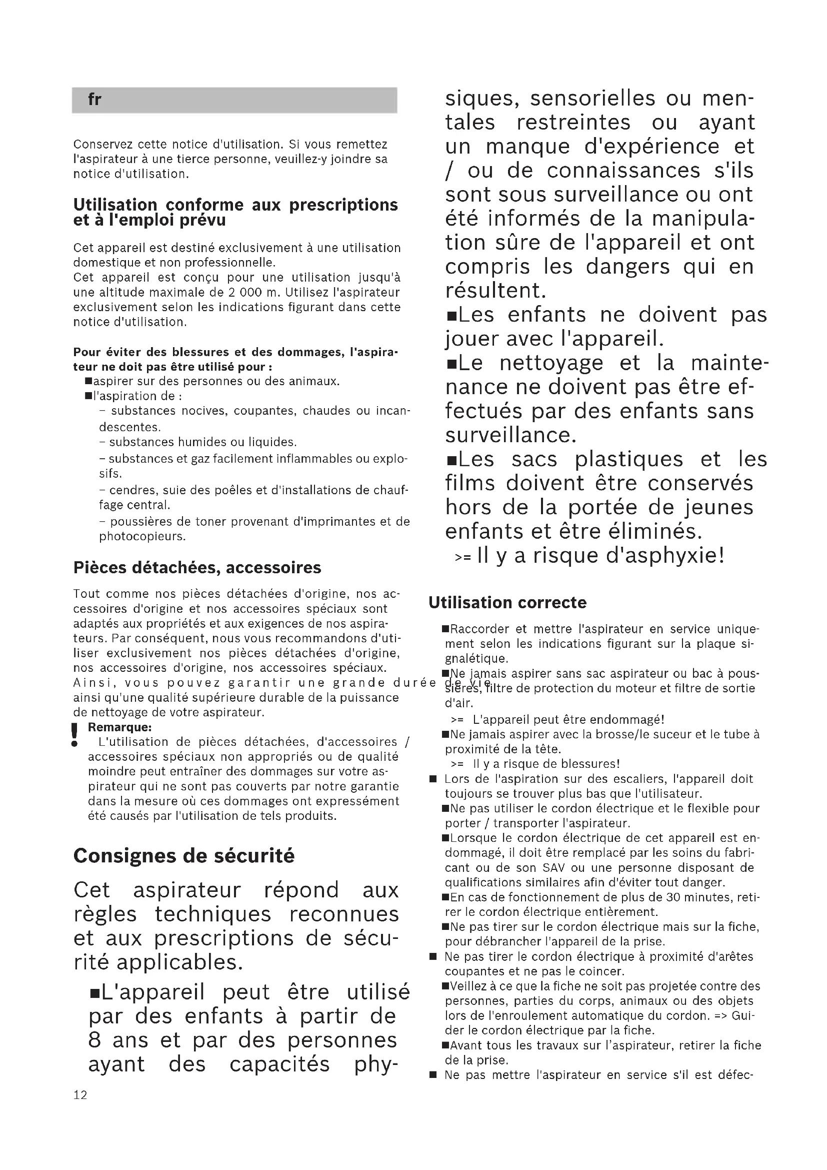 Conservez cette notice d'utilisation. Si vous remettez l'aspirateur à une tierce personne, veuillez-y joindre sa notice d'utilisation. Utilisation conforme aux prescriptions et à l'emploi prévu Cet appareil est destiné exclusivement à une utilisation domestique et non professionnelle. Cet appareil est conçu pour une utilisation jusqu'à une altitude maximale de 2 000 m. Utilisez l'aspirateur exclusivement selon les indications figurant dans cette notice d'utilisation. Pour éviter des blessures et des dommages, l'aspira- teur ne doit pas être utilisé pour : aspirer sur des personnes ou des animaux. l'aspiration de : − substances nocives, coupantes, chaudes ou incan-descentes. − substances humides ou liquides. − substances et gaz facilement inflammables ou explo-sifs. − cendres, suie des poêles et d'installations de chauf-fage central. − poussières de toner provenant d'imprimantes et de photocopieurs. Pièces détachées, accessoires Tout comme nos pièces détachées d'origine, nos ac-cessoires d'origine et nos accessoires spéciaux sont adaptés aux propriétés et aux exigences de nos aspira-teurs. Par conséquent, nous vous recommandons d'uti-liser exclusivement nos pièces détachées d'origine, nos accessoires d'origine, nos accessoires spéciaux. Ainsi, vous pouvez garantir une grande durée de vie ainsi qu'une qualité supérieure durable de la puissance de nettoyage de votre aspirateur. Remarque: L'utilisation de pièces détachées, d'accessoires / accessoires spéciaux non appropriés ou de qualité moindre peut entraîner des dommages sur votre as-pirateur qui ne sont pas couverts par notre garantie dans la mesure où ces dommages ont expressément été causés par l'utilisation de tels produits. Consignes de sécurité Cet aspirateur répond aux règles techniques reconnues et aux prescriptions de sécu- rité applicables. L'appareil peut être utilisé par des enfants à partir de 8 ans et par des personnes ayant des capacités phy- siques, sensorielles ou men- tales restreintes ou ayant un manque d'expérience et / ou de connaissances s'ils sont sous surveillance ou ont été informés de la manipula- tion sûre de l'appareil et ont compris les dangers qui en résultent. Les enfants ne doivent pas jouer avec l'appareil. Le nettoyage et la mainte- nance ne doivent pas être ef- fectués par des enfants sans surveillance. Les sacs plastiques et les films doivent être conservés hors de la portée de jeunes enfants et être éliminés. >= Il y a risque d'asphyxie! Utilisation correcte Raccorder et mettre l'aspirateur en service unique-ment selon les indications figurant sur la plaque si-gnalétique. Ne jamais aspirer sans sac aspirateur ou bac à pous-sières, filtre de protection du moteur et filtre de sortie d'air. >= L'appareil peut être endommagé! Ne jamais aspirer avec la brosse/le suceur et le tube à proximité de la tête.>= Il y a risque de blessures! Lors de l'aspiration sur des escaliers, l'appareil doit toujours se trouver plus bas que l'utilisateur. Ne pas utiliser le cordon électrique et le flexible pour porter / transporter l'aspirateur. Lorsque le cordon électrique de cet appareil est en-dommagé, il doit être remplacé par les soins du fabri-cant ou de son SAV ou une personne disposant de qualifications similaires afin d'éviter tout danger. En cas de fonctionnement de plus de 30 minutes, reti-rer le cordon électrique entièrement. Ne pas tirer sur le cordon électrique mais sur la fiche, pour débrancher l'appareil de la prise. Ne pas tirer le cordon électrique à proximité d'arêtes coupantes et ne pas le coincer. Veillez à ce que la fiche ne soit pas projetée contre des personnes, parties du corps, animaux ou des objets lors de l'enroulement automatique du cordon. => Gui-der le cordon électrique par la fiche. Avant tous les travaux sur l’aspirateur, retirer la fiche de la prise. Ne pas mettre l'aspirateur en service s'il est défec-13 tueux. En cas de panne, retirer la fiche de la prise. Pour éviter tout risque de danger, seul le service après-vente agréé est autorisé à effectuer des répara-tions et à remplacer des pièces sur l’aspirateur. Ne pas exposer l'aspirateur aux influences atmosphé-riques, à l'humidité ni aux sources de chaleur. Ne pas mettre des substances inflammables ou à base d'alcool sur les filtres (filtre de protection du moteur, filtre de sortie d'air etc.). L'aspirateur n'est pas approprié au travail de chantier. >= L’aspiration de gravats risque d’endommager l'ap-pareil. Éteignez l’appareil et débranchez-le, si vous ne l'uti- lisez pas. Rendre immédiatement inutilisables les appareils hors d'usage, ensuite mettre l'appareil au rebut de façon réglementaire. Important La prise de secteur doit être protégée par un fusible d'au moins 16 A. Si le disjoncteur se déclenche lors de la mise en marche de l'appareil, ceci peut être dû au fait que d'autres appareils électriques d'une puissance connectée élevée sont branchés en même temps sur le même circuit électrique. Le déclenchement du disjoncteur peut être évité en réglant l'appareil sur la plus faible puissance avant de le mettre en marche et en le réglant ensuite sur une puissance supérieure. Consignes pour la mise au rebut Eliminez l’emballage en respectant l’envi-ronnement. Cet appareil est marqué selon la directive européenne 2012/19/UE relative aux appareils électriques et électroniques usagés (waste electrical and electronic equipment – WEEE). La directive définit le cadre pour une reprise et une récupération des appareils usa-gés applicables dans les pays de la CE. S’in-former auprès du revendeur sur la procédure actuelle de recyclage. Emballage L'emballage protège l'aspirateur pendant le trans-port. Il est constitué de matériaux écologiques et est donc recyclable. Les matériaux d'emballage qui ne sont plus utilisés doivent être mis au rebut aux points collecteurs du système de re