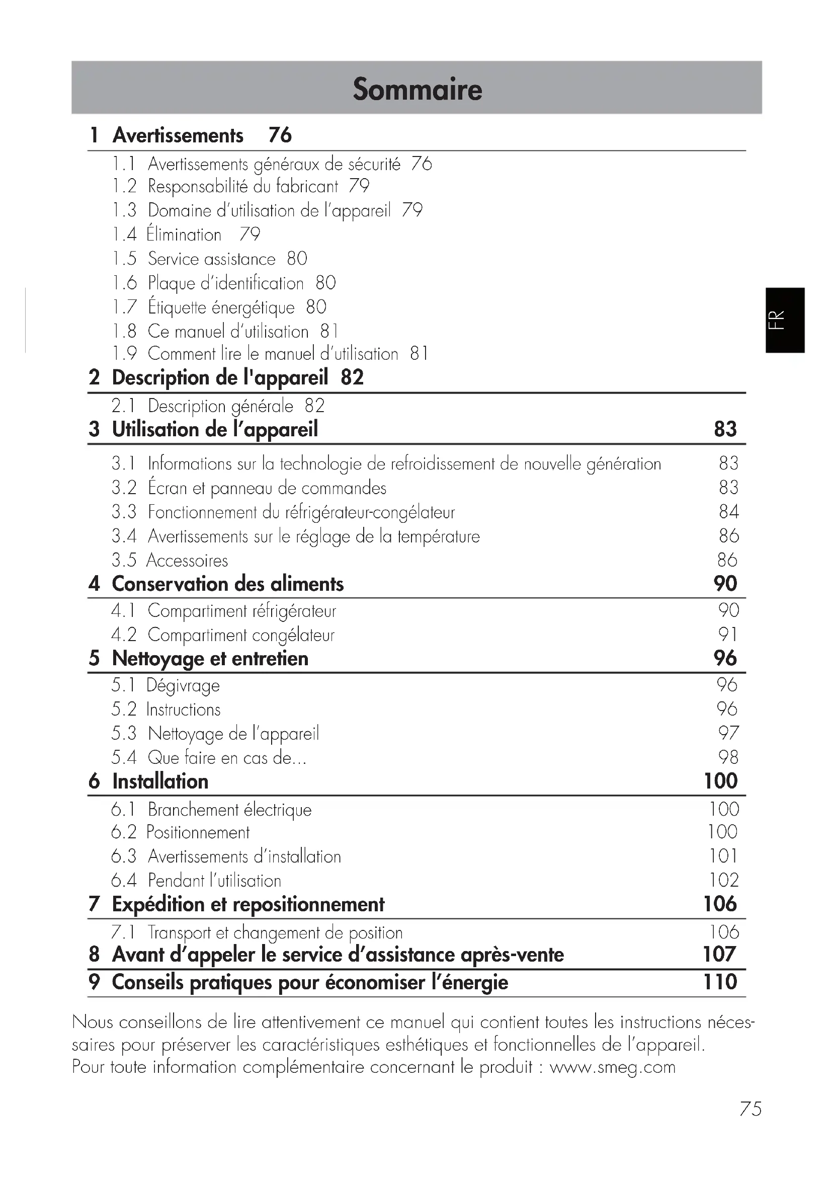 Nous conseillons de lire attentivement ce manuel qui contient toutes les instructions néces- saires pour préserver les caractéristiques esthétiques et fonctionnelles de l’appareil. Pour toute information complémentaire concernant le produit : www.smeg.com 1 Avertissements 76