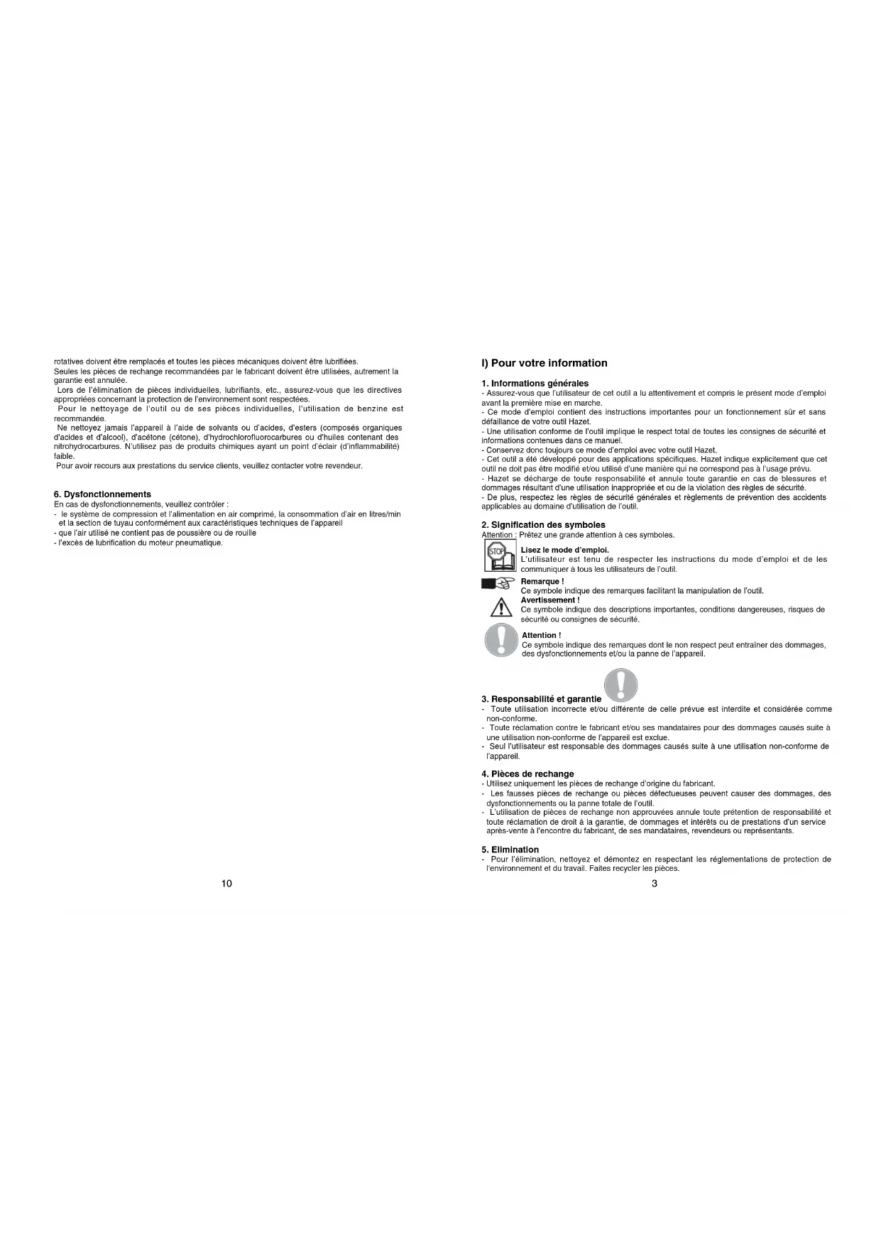 - Assurez-vous que l’utilisateur de cet outil a lu attentivement et compris le présent mode d’emploi avant la première mise en marche. - Ce mode d’emploi contient des instructions importantes pour un fonctionnement sûr et sans défaillance de votre outil Hazet. - Une utilisation conforme de l’outil implique le respect total de toutes les consignes de sécurité et informations contenues dans ce manuel. - Conservez donc toujours ce mode d’emploi avec votre outil Hazet. - Cet outil a été développé pour des applications spécifiques. Hazet indique explicitement que cet outil ne doit pas être modifié et/ou utilisé d’une manière qui ne correspond pas à l’usage prévu. - Hazet se décharge de toute responsabilité et annule toute garantie en cas de blessures et dommages résultant d’une utilisation inappropriée et ou de la violation des règles de sécurité. - De plus, respectez les règles de sécurité générales et règlements de prévention des accidents applicables au domaine d’utilisation de l’outil.