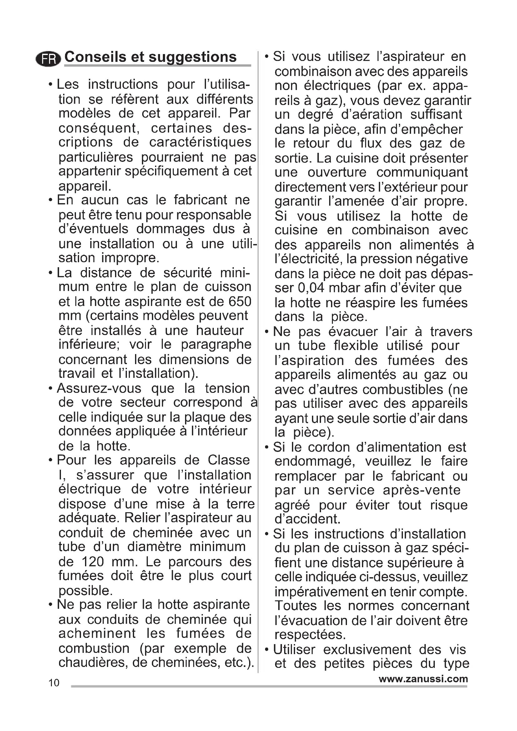 - Utiliser exclusivement des vis et des petites pièces du type FR11 www.zanussi.com adapté pour la hotte. Attention : toute installation des vis et des dispositifs de xation non conforme aux présentes instructions peut entraîner des risques de décharges élec- triques.