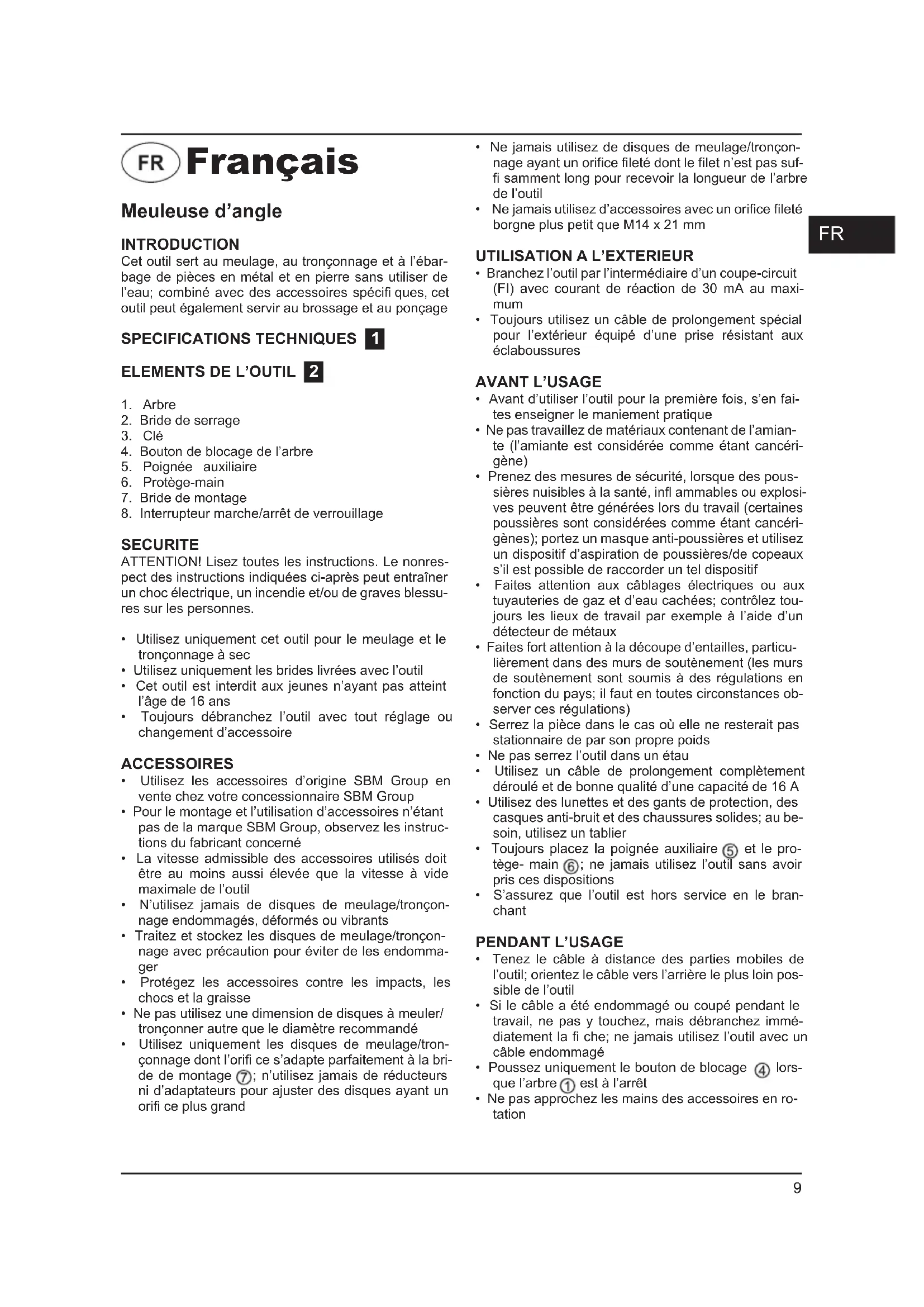 - Avant de déposer l’outil, mettez le moteur hors ser-vice et s’assurez que toutes les pièces mobiles se sont complètement arrêtées• Après la mise hors service, ne jamais arrêtez la ro-tation de l’accessoire en exerçant une force latéraleLa machine est doublement isolée conformé-ment a la norme EN50144; un fi l de mise à la terre n’est pas donc pas nécessaire. ENTRETIEN Assurez-vous que la machine n’est pas sous tension si vous allez procéder à des travaux d’entretien dans son système mécanique.Nettoyez régulièrement le carter au moyen d’un chif-fon doux, de préférence a Tissue de chaque utilisation. Veillez à ce que les fentes d’aération soient indemnes de poussière et de saletés.En présence de saleté tenace, employez un chiffon doux humecté d’eau savonneuse. Proscrivez l’emploi de solvants comme l’essence, l’alcool, l’ammoniaque etc. car ces substances attaquent les pièces en plas-tique. Cette machine ne nécessite pas de graissage supplémentaire.En cas de panne survenue par exemple à la suite de l’usure d’une pièce, contactez votre distributeur SBM Group local. ENVIRONNEMENT Pour éviter les dommages liés au transport, la machine est livré dans un emballage robuste. L’emballage est autant que possible constitué de matériau recyclable. Veuillez par conséquent destiner cet emballage au re-cyclage.Si vous allez changer de machines, apportez les ma-chines usagées à votre distributeur SBM Group local qui se chargera de les traiter de la manière la plus éco-logique possible. Amoladora angular INTRODUCCIÓN Esta herramienta ha sido diseñada para amolar, tron-zar y desbarbar materiales de metal y piedra sin nece-sidad de utilizar agua; con los accesorios apropiados, también se puede utilizar la herramienta para cepillar y lijar CARACTERISTICAS TECNICAS 1