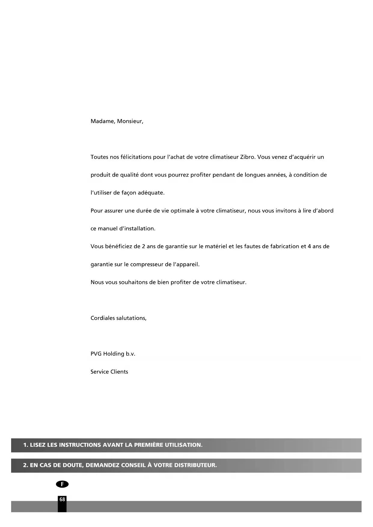 Madame, Monsieur, Toutes nos félicitations pour l’achat de votre climatiseur Zibro. Vous venez d’acquérir un produit de qualité dont vous pourrez profiter pendant de longues années, à condition de l’utiliser de façon adéquate. Pour assurer une durée de vie optimale à votre climatiseur, nous vous invitons à lire d’abord ce manuel d’installation. Vous bénéficiez de 2 ans de garantie sur le matériel et les fautes de fabrication et 4 ans de garantie sur le compresseur de l’appareil. Nous vous souhaitons de bien profiter de votre climatiseur. Cordiales salutations, PVG Holding b.v. Service Clients man_S(C)32xx.qxd:man_S18xx 12-02-13 09:57 Page 683