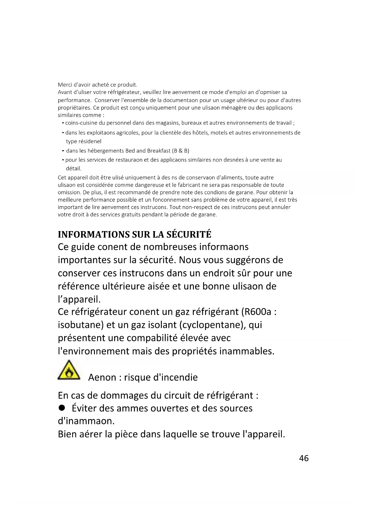 Ce guide contient de nombreuses informations importantes sur la sécurité. Nous vous suggérons de conserver ces instructions dans un endroit sûr pour une référence ultérieure aisée et une bonne utilisation de l’appareil. Ce réfrigérateur contient un gaz réfrigérant (R600a : isobutane) et un gaz isolant (cyclopentane), qui présentent une compatibilité élevée avec l'environnement mais des propriétés inflammables. Attention : risque d'incendie En cas de dommages du circuit de réfrigérant : Éviter des flammes ouvertes et des sources d'inflammation. Bien aérer la pièce dans laquelle se trouve l'appareil.47 rcentage :fonctionnement 30 min,arrêt l5 m AVERTISSEMENT ! Il convient de prêter une attention particulière lors du nettoyage/du transport de l’appareil pour éviter de toucher les fils métalliques du condenseur à l’arrière de l’appareil, en raison du risque de blessures aux doigts et aux mains et du risque de détérioration de l’appareil. Cet appareil n'est pas conçu pour être empilé avec un autre appareil. Ne pas essayer de s'asseoir ou de se tenir debout sur le dessus de votre appareil étant donné qu’il n’est pas conçu à cet effet. Vous pourriez vous blesser ou endommager l'appareil. Assurez-vous que le câble secteur ne se retrouve pas coincé sous l’appareil pendant et après le transport/le déplacement de l'appareil, pour éviter de couper ou d’endommager le câble secteur. Au moment de positionner votre appareil, veillez à ne pas endommager votre plancher, vos tuyaux, les revêtements muraux etc. Ne déplacez pas l’appareil en le tirant par le couvercle ou la poignée. Ne laissez pas les enfants jouer avec l’appareil ou falsifier les commandes. Notre entreprise décline toute responsabilité en cas de non-respect des instructions. Ne pas installer l'appareil dans des endroits humides, huileux ou poussiéreux, ne pas l'exposer à la lumière directe du soleil et à l'eau.48 Ne pas installer l'appareil à proximité de radiateurs ou de matériaux inflammables. En cas de panne de courant, n'ouvrez pas le couvercle. Si la panne dure moins de 20 heures, les aliments surgelés ne devraient pas être affectés. Si la panne dure plus longtemps, alors il convient de vérifier les aliments et de les manger immédiatement ou bien de les cuire et de les congeler à nouveau. Si vous trouvez que le couvercle du congélateur coffre est difficile à ouvrir juste après l’avoir ouvert, ne soyez pas inquiet. Cela vient de la différence de pression qui doit s'égaliser et permettre au couvercle de s’ouvrir normalement après quelques minutes. Ne pas brancher l’appareil à l'alimentation électrique avant d’avoir retiré tous les protecteurs d'emballage et de transport. Le laisser reposer au moins 4 heures avant de l’allumer pour permettre à l'huile du compresseur de décanter s’il a été transporté horizontalement. Ce congélateur doit uniquement être utilisé aux fins prévues (c.-à-d. la conservation et la congélation de denrées comestibles). Ne pas conserver des médicaments ou des substances de recherche dans le rafraîchisseur de vin. Lorsque la matière à conserver requiert un contrôle strict des températures de conservation,49 il est possible qu'elle se détériore ou qu'une réaction incontrôlée se produise, laquelle peut entraîner des risques. Avant de procéder à tout fonctionnement, débrancher le cordon électrique de la prise électrique. A la livraison, vérifiez que le produit n'est pas endommagé et que toutes les pièces et les accessoires sont en parfait état. Si une fuite est détectée dans le système de réfrigération, ne pas toucher la sortie murale et ne pas utiliser de flammes ouvertes. Ouvrir la fenêtre et aérer la pièce. Ensuite appeler un service après- ventes pour demander une réparation. Ne pas utiliser de rallonges ni d'adaptateurs. Ne pas tirer ou plier de manière excessive le cordon d'alimentation ou ne pas toucher la fiche avec les mains mouillées. Ne pas endommager la fiche et/ou le cordon d'alimentation ; cela pourrait provoquer des chocs électriques ou des incendies. Si le câble d’alimentation est endommagé, il doit être remplacé par le fabriquant, un agent après- vente ou toute autre personne qualifiée pour éviter tout danger. Ne pas placer ou conserver des substances inflammables ou hautement volatiles tels que l'éther, le pétrole, le GPL, le gaz propane, les50 bombes d'aérosol, les colles, l'alcool pur etc. Ces substances peuvent provoquer une explosion. Ne pas utiliser ou conserver des sprays inflammables, tels que de la peinture en aérosol, auprès du rafraîchisseur de vin. Cela pourrait entraîner une explosion ou un incendie. Ne pas placer d'objets et/ou de récipients contenant de l'eau sur le dessus de l'appareil. Nous ne recommandons pas l'utilisation de rallonges et d’adaptateurs multiples. Ne pas jeter l'appareil au feu. Veiller à ne pas endommager le circuit/les tuyaux de refroidissement de l’appareil pendant le transport et l’utilisation. En cas de dommage, ne pas exposer l’appareil au feu, à une source d'inflammation potentielle et aérer immédiatement la pièce dans laquelle se trouve l’appareil. Le système de réfrigération positionné derrière et à l'intérieur du rafraîchisseur de vin contient du réfrigérant. Par conséquent, éviter d'endommager les tuyaux. Ne pas utiliser d’appareils électriques à l'intérieur des compartiments de conservation des aliments de l'appareil, sauf s'ils correspondent aux modèles recommandés par le fabricant. Ne pas endommager circuit réfrigérant. Ne pas utiliser de dispositifs mécaniques ou d’autres moyens pour accélérer le processus de51 dégivrage, hormis ceux recommandés par le fabricant. Ne pas utiliser d’appareils électriques à l'intérieur des compartiments de conservation des aliments, sauf s'ils correspondent aux modèles recommandés par le fabricant. Ne touchez