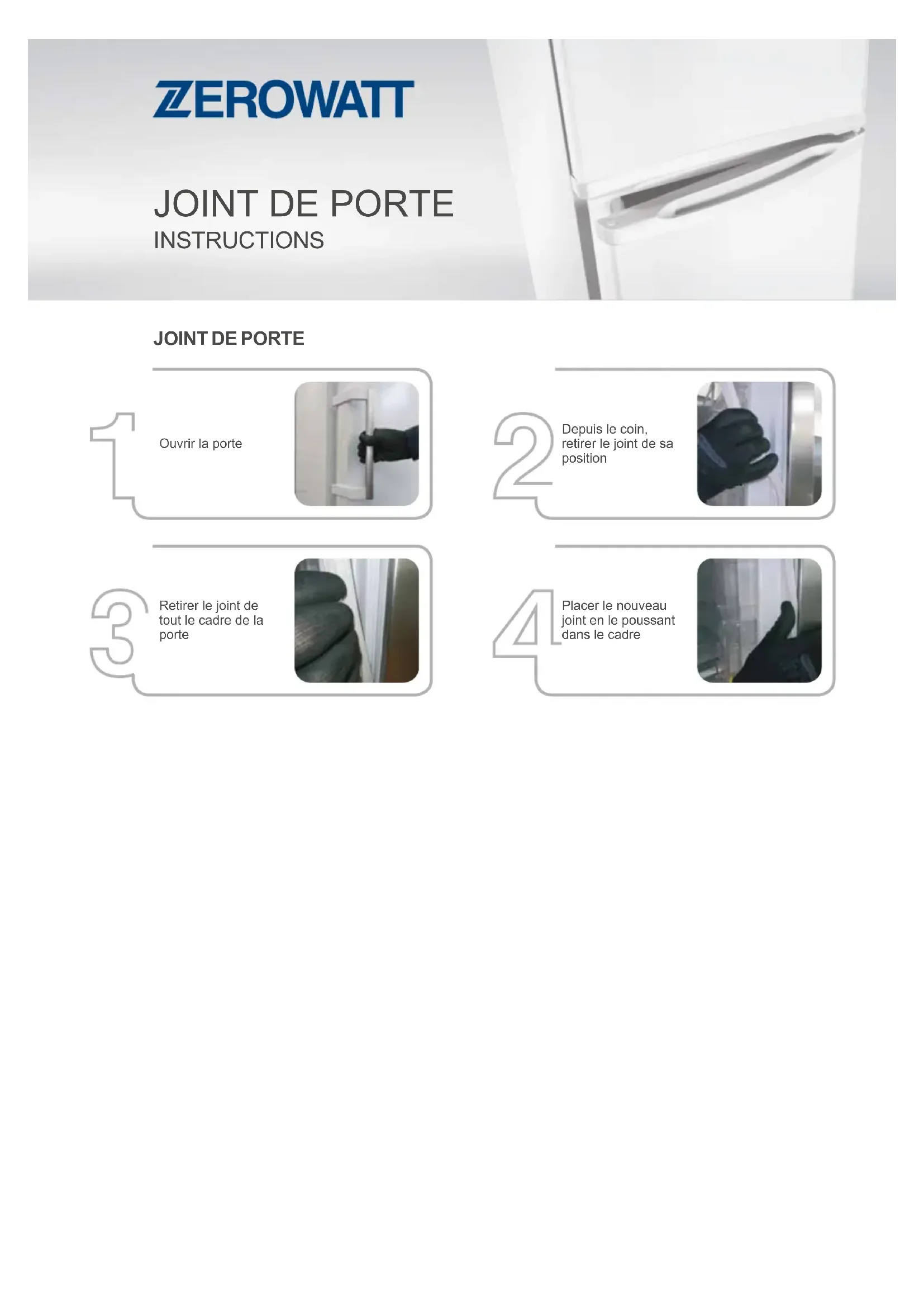 INSTRUCTIONS Ouvrir la porte Depuis le coin, retirer le joint de sa position Retirer le joint de tout le cadre de la porte Placer le nouveau joint en le poussant dans le cadrePORTE RÉVERSIBLE OUTILS: TOURNEVIS CRUCIFORME-TOURNEVIS PLAT