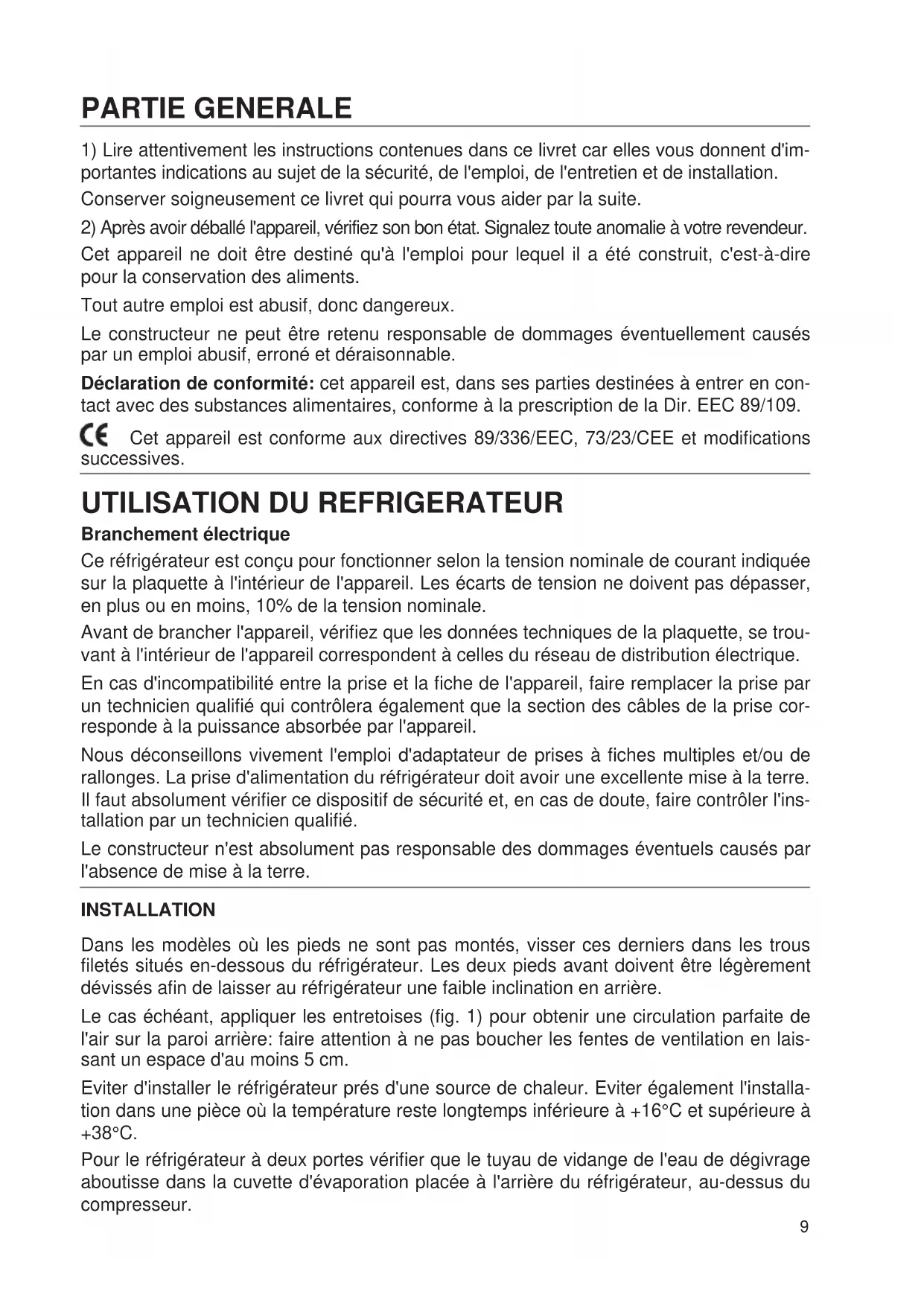 Cet appareil ne doit être destiné qu'à l'emploi pour lequel il a été construit, c'est-à-dire pour la conservation des aliments. Tout autre emploi est abusif, donc dangereux. Le constructeur ne peut être retenu responsable de dommages éventuellement causés par un emploi abusif, erroné et déraisonnable. Déclaration de conformité: cet appareil est, dans ses parties destinées à entrer en con- tact avec des substances alimentaires, conforme à la prescription de la Dir. EEC 89/109. Cet appareil est conforme aux directives 89/336/EEC, 73/23/CEE et modifications successives.