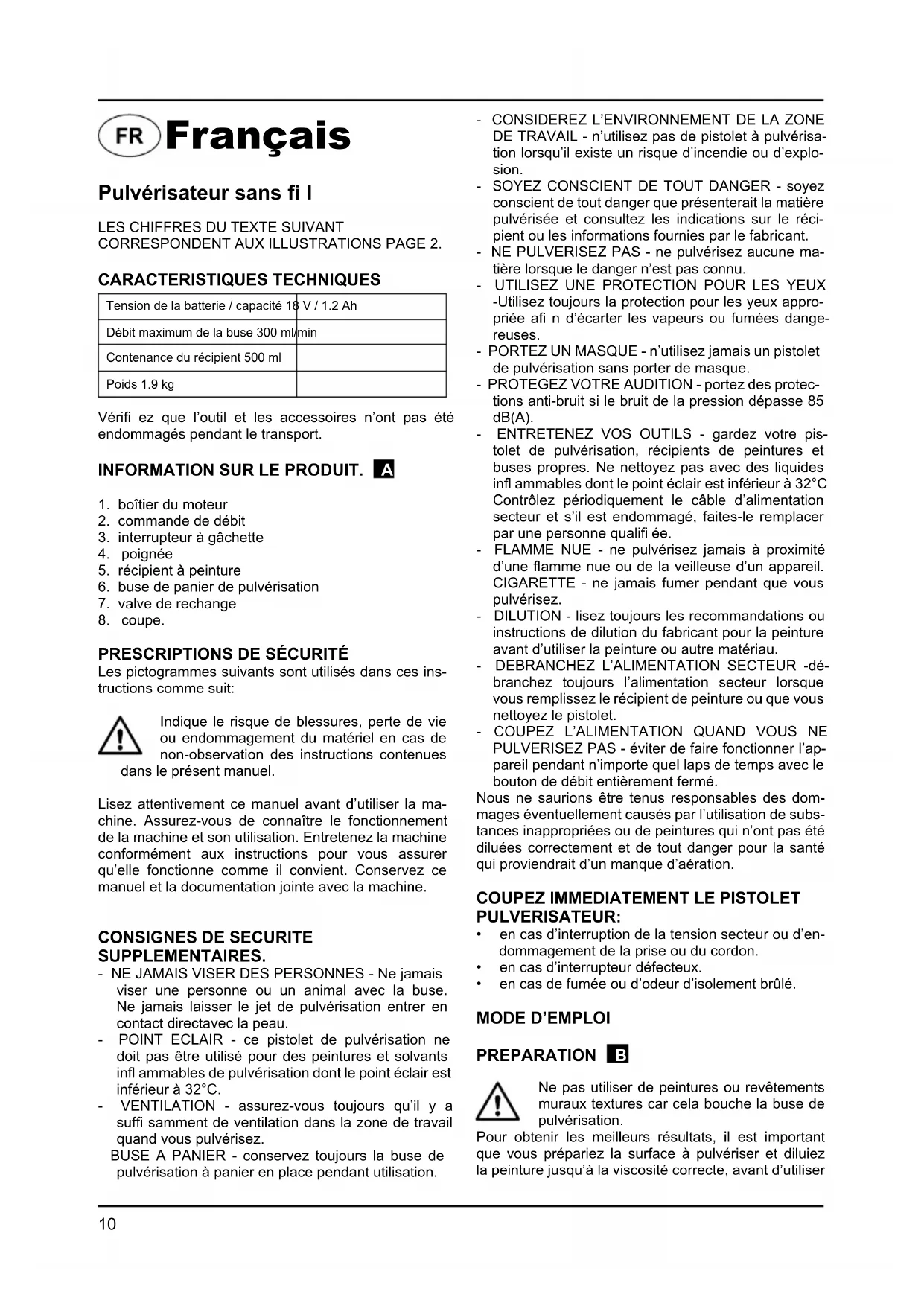 SUPPLEMENTAIRES. - NE JAMAIS VISER DES PERSONNES - Ne jamais viser une personne ou un animal avec la buse. Ne jamais laisser le jet de pulvérisation entrer en contact directavec la peau. - POINT ECLAIR - ce pistolet de pulvérisation ne doit pas être utilisé pour des peintures et solvants infl ammables de pulvérisation dont le point éclair est inférieur à 32°C. - VENTILATION - assurez-vous toujours qu’il y a suffi samment de ventilation dans la zone de travail quand vous pulvérisez. BUSE A PANIER - conservez toujours la buse de pulvérisation à panier en place pendant utilisation.