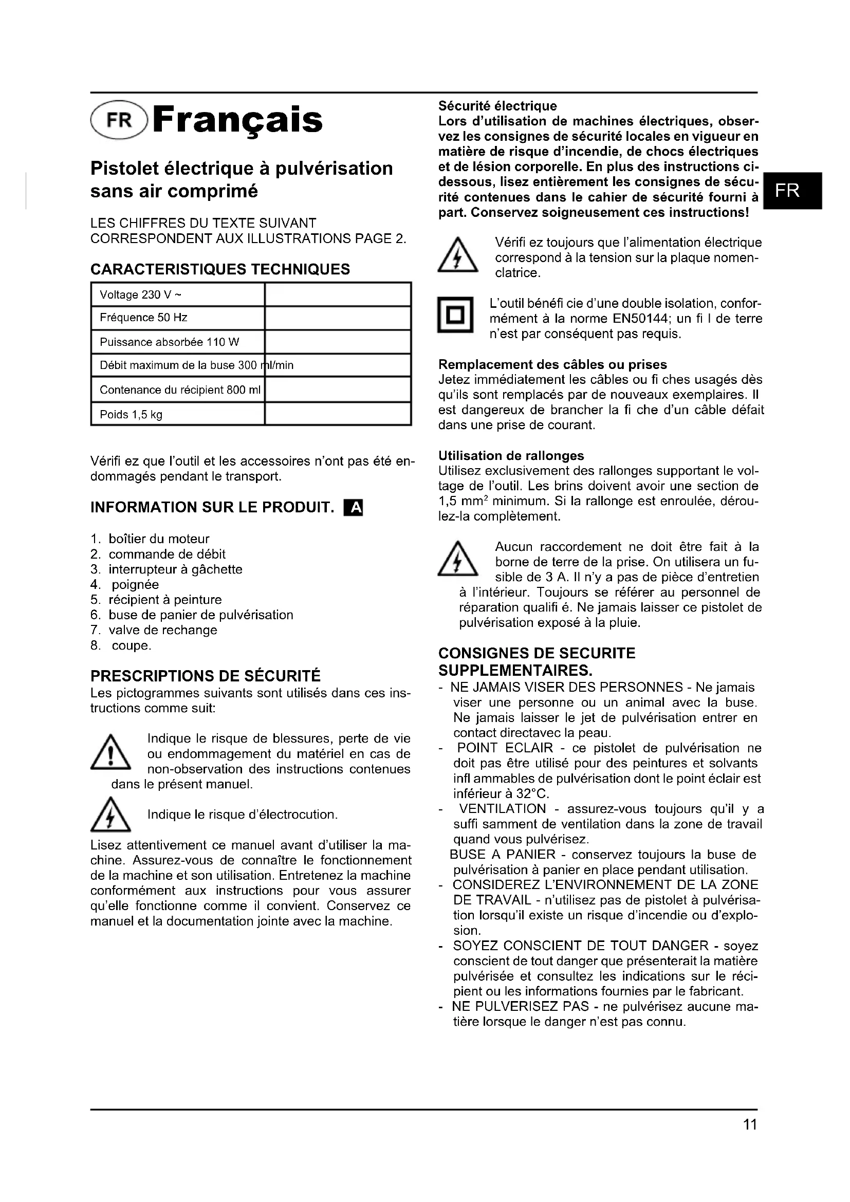 CORRESPONDENT AUX ILLUSTRATIONS PAGE 2. CARACTERISTIQUES TECHNIQUES Voltage 230 V ~ Fréquence 50 Hz Puissance absorbée 110 W Débit maximum de la buse 300 ml/min Contenance du récipient 800 ml Poids 1,5 kg Vérifi ez que l’outil et les accessoires n’ont pas été en- dommagés pendant le transport.