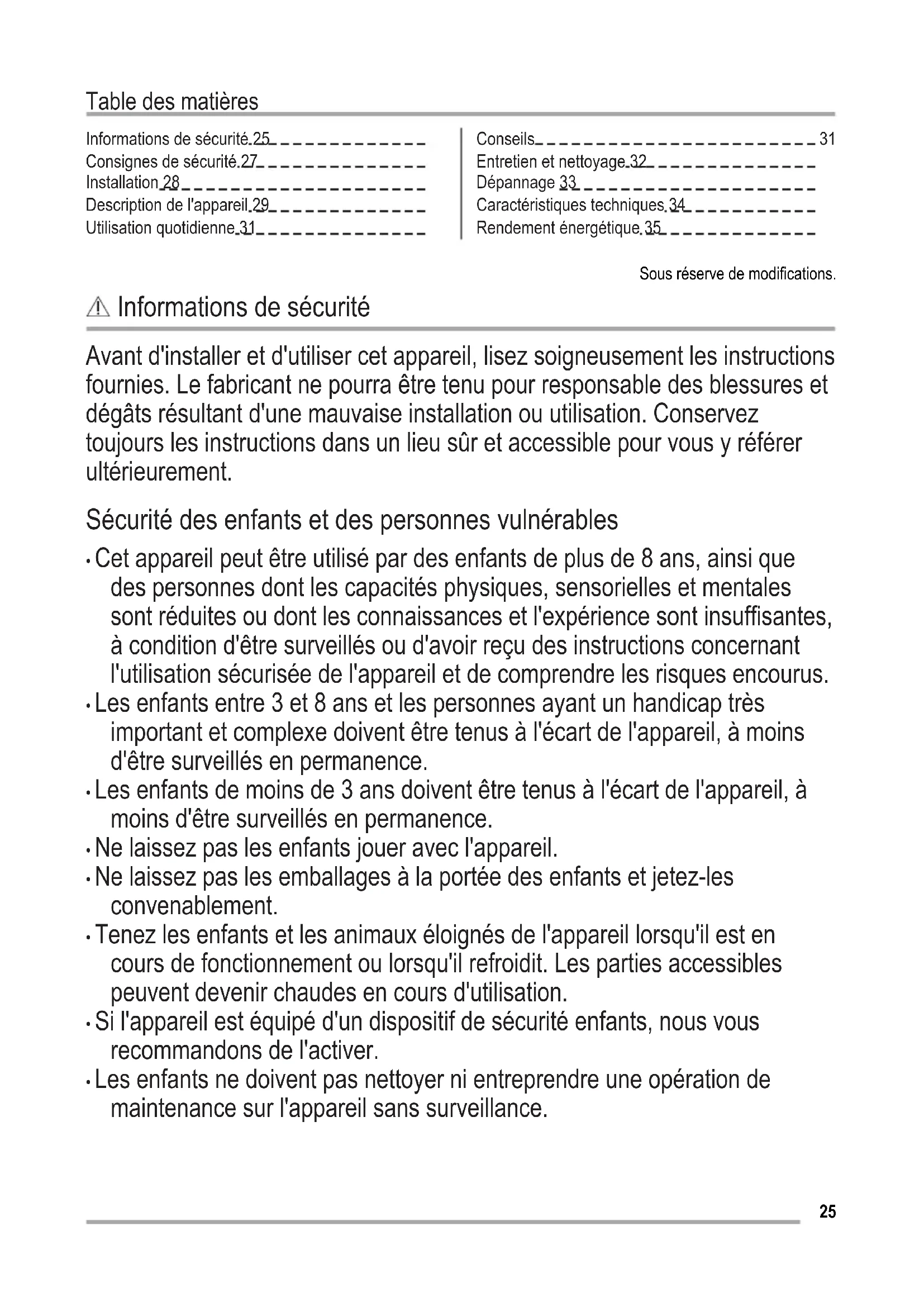 Entretien et nettoyage 32 Dépannage 33 Caractéristiques techniques 34 Rendement énergétique 35 Sous réserve de modifications. Informations de sécurité Avant d'installer et d'utiliser cet appareil, lisez soigneusement les instructions fournies. Le fabricant ne pourra être tenu pour responsable des blessures et dégâts résultant d'une mauvaise installation ou utilisation. Conservez toujours les instructions dans un lieu sûr et accessible pour vous y référer ultérieurement. Sécurité des enfants et des personnes vulnérables