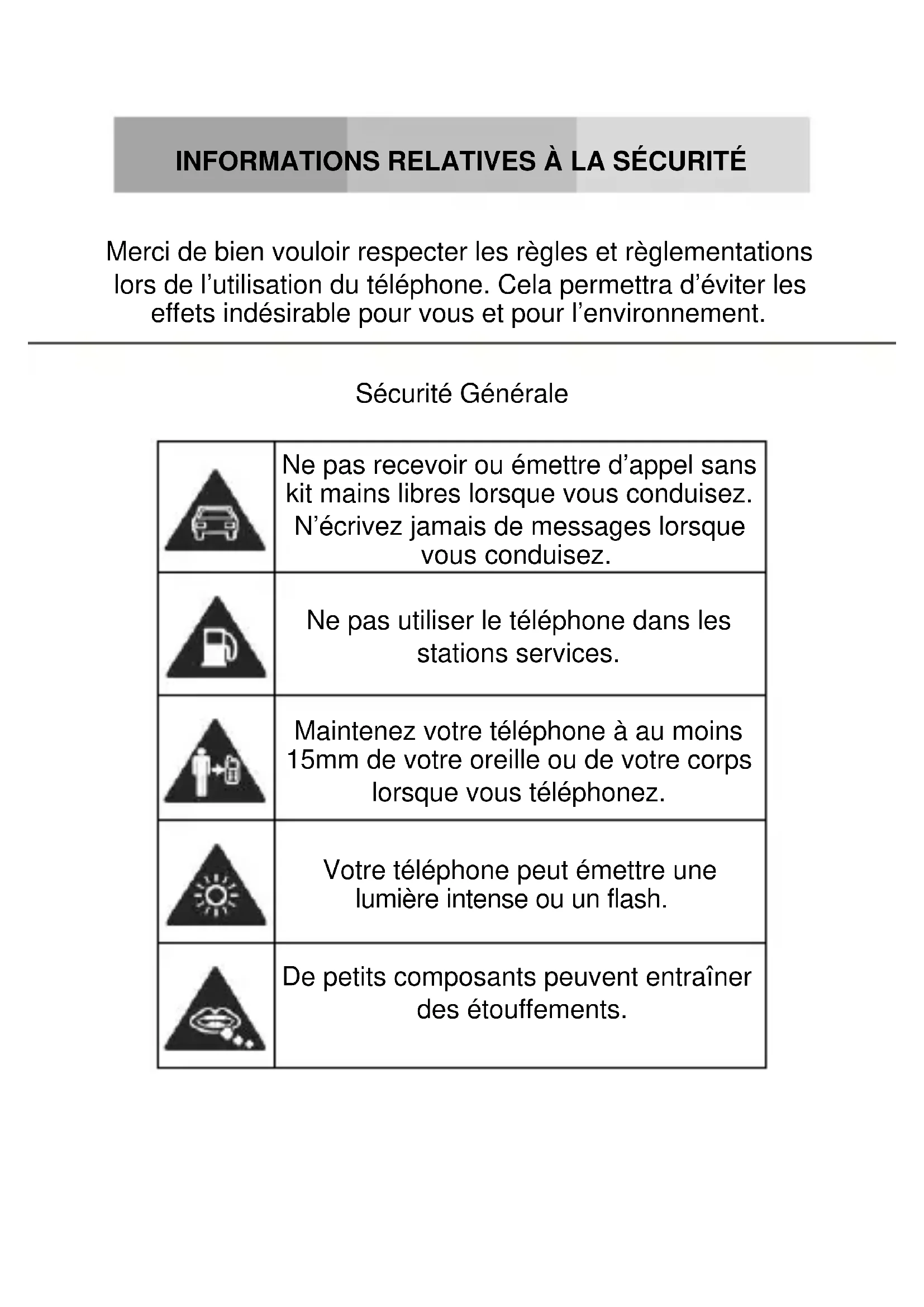 Merci de bien vouloir respecter les règles et règlementations lors de l’utilisation du téléphone. Cela permettra d’éviter les effets indésirable pour vous et pour l’environnement. Sécurité Générale