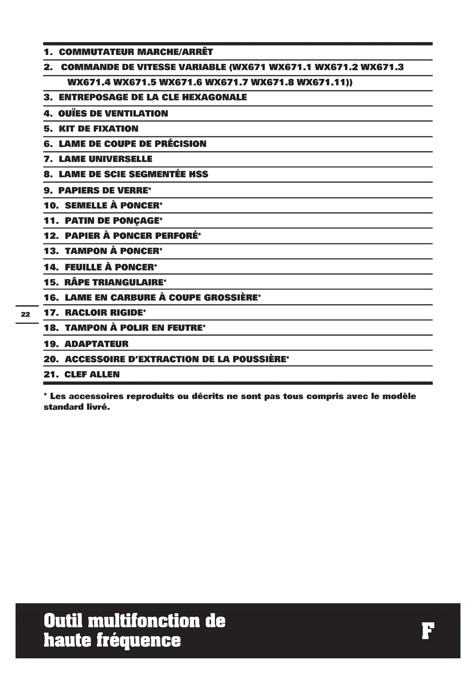 - Les accessoires reproduits ou décrits ne sont pas tous compris avec le modèle standard livré.23