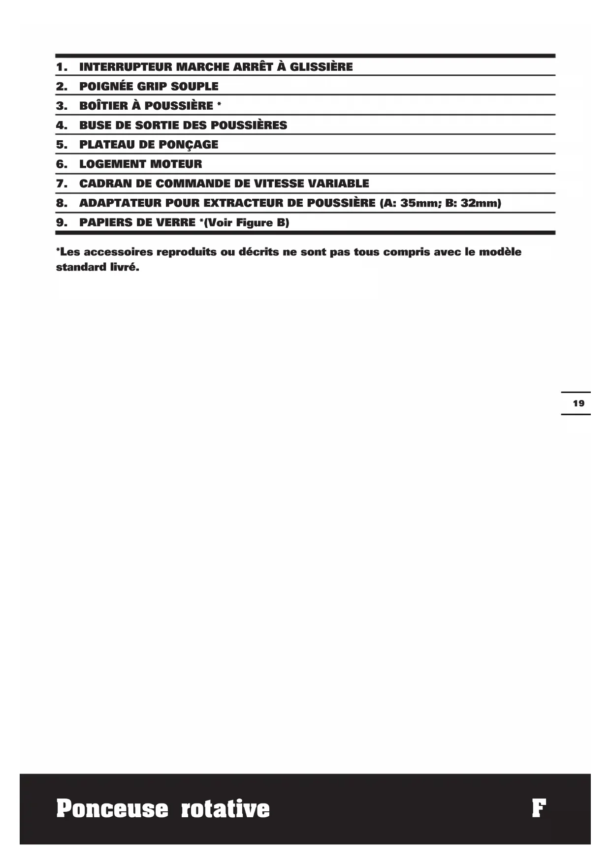 *Les accessoires reproduits ou décrits ne sont pas tous compris avec le modèle standard livré.Ponceuse rotative F
