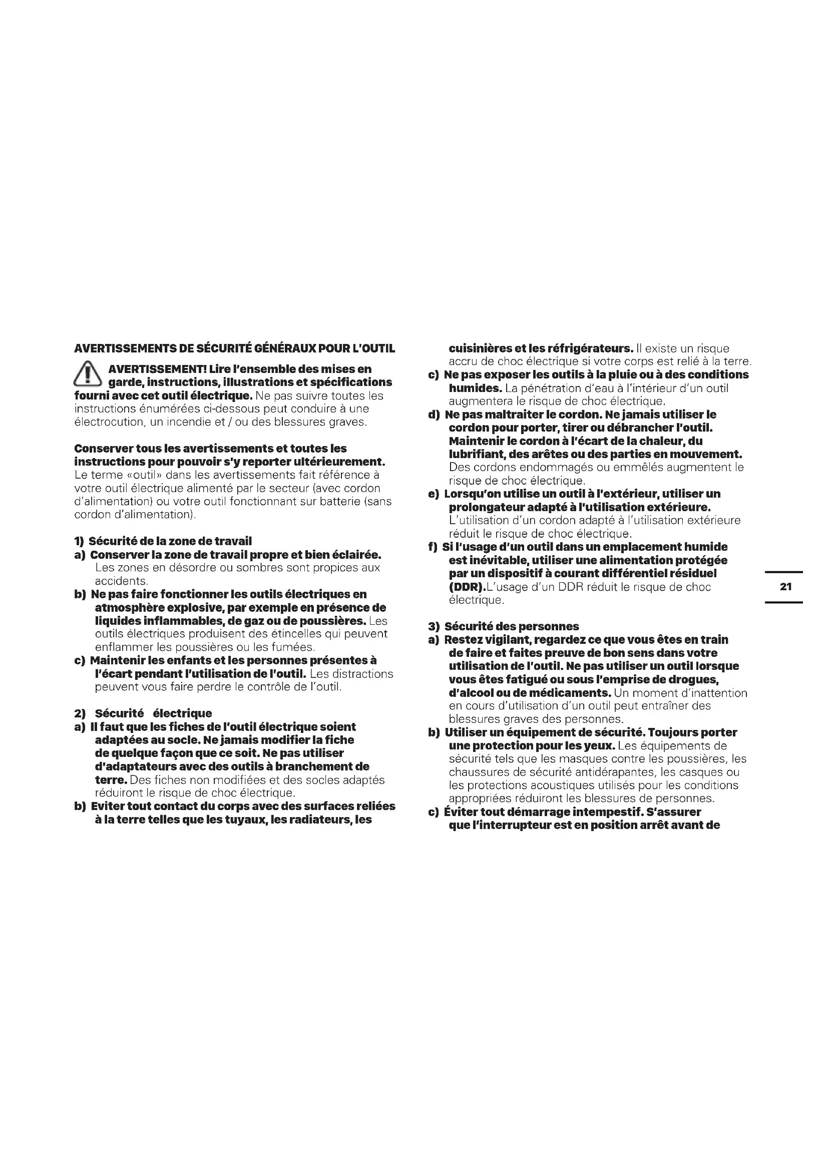 c) Ne pas exposer les outils à la pluie ou à des conditions humides. La pénétration d'eau à l'intérieur d'un outil augmentera le risque de choc électrique. d) Ne pas maltraiter le cordon. Ne jamais utiliser le cordon pour porter, tirer ou débrancher l'outil. Maintenir le cordon à l'écart de la chaleur, du lubrifiant, des arêtes ou des parties en mouvement. Des cordons endommagés ou emmêlés augmentent le risque de choc électrique. e) Lorsqu'on utilise un outil à l'extérieur, utiliser un prolongateur adapté à l'utilisation extérieure. L'utilisation d'un cordon adaptée à l'utilisation extérieure réduit le risque de choc électrique. f) Si l'utilisation d'un outil dans un emplacement humide est inévitable, utiliser une alimentation protégée par un dispositif à courant différentiel résiduel (DDR). L'utilisation d'un DDR réduit le risque de choc électrique.