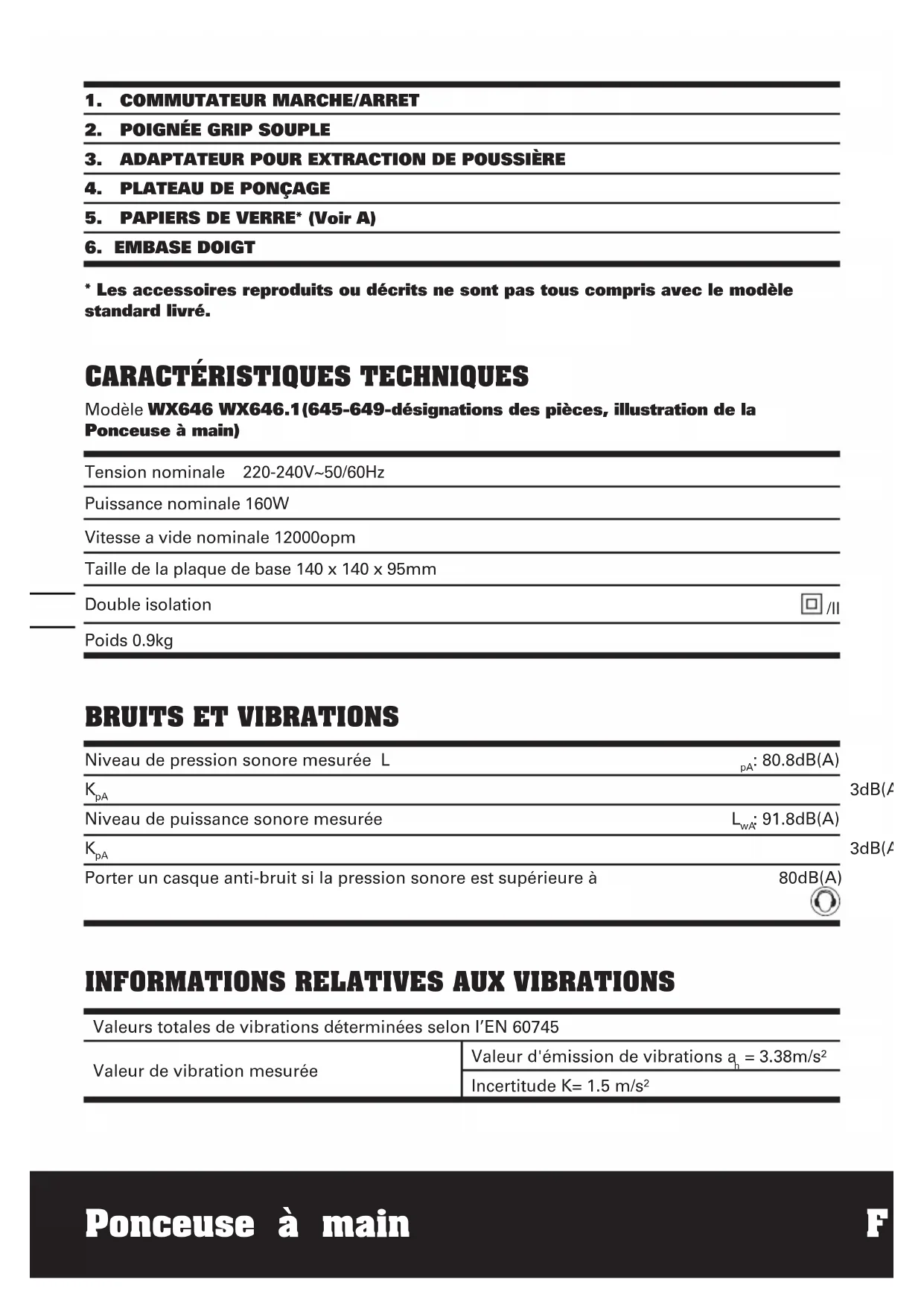 = 3.38m/s² Incertitude K= 1.5 m/s²1514 Ponceuse à main F ACCESSOIRES Papiers de verre: 9 80 grain; 2 100 grain; 2 120 grain; 2 Ponceuse à papier avec repose doigt 3 Patin 1 Adaptateur pour extraction de poussière 1 Nous recommandons d’acheter tous les accessoires dans le magasin d’acquisition de la machine. Il est impératif d’utiliser des accessoires de bonne qualité et de marque connue et de choisir l’accessoire correct recommandé dans ce manuel. Pour plus d’informations, se référer à l’emballage des accessoires. Le personnel du magasin est également là pour vous conseiller.