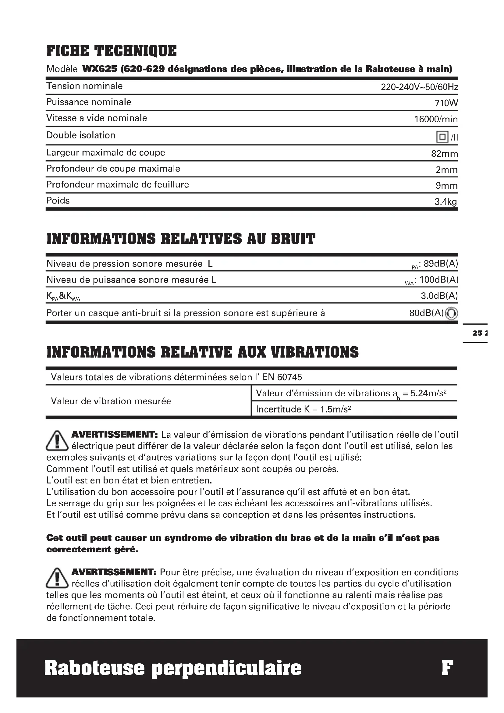 Déclarons que ce produit, Description WORX Raboteuse perpendicular Modele WX625 (620-629 désignations des pieces, illustration de la Raboteuse à main) Fonctions Enlever le revêtement de la surface avec un couteau rotatif