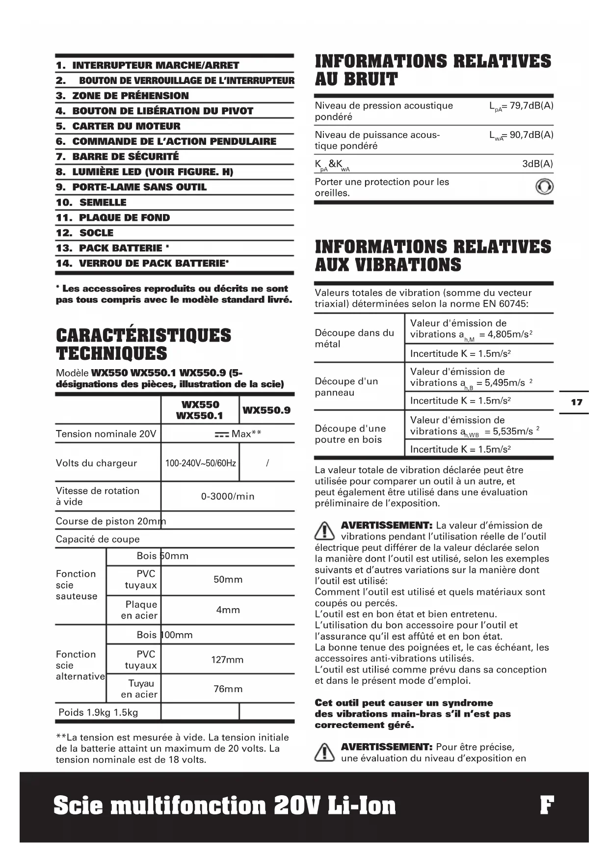 Planifiez votre travail pour étaler l’utilisation des outils à forte vibration sur plusieurs jours. ACCESSOIRES WX550 WX550.1 WX550.9 1 heure Chargeur (WA3860) 1 1 / 2Ah Batterie (WA3551.1) 1 2 / Lame de scie sauteuse pour coupe de bois