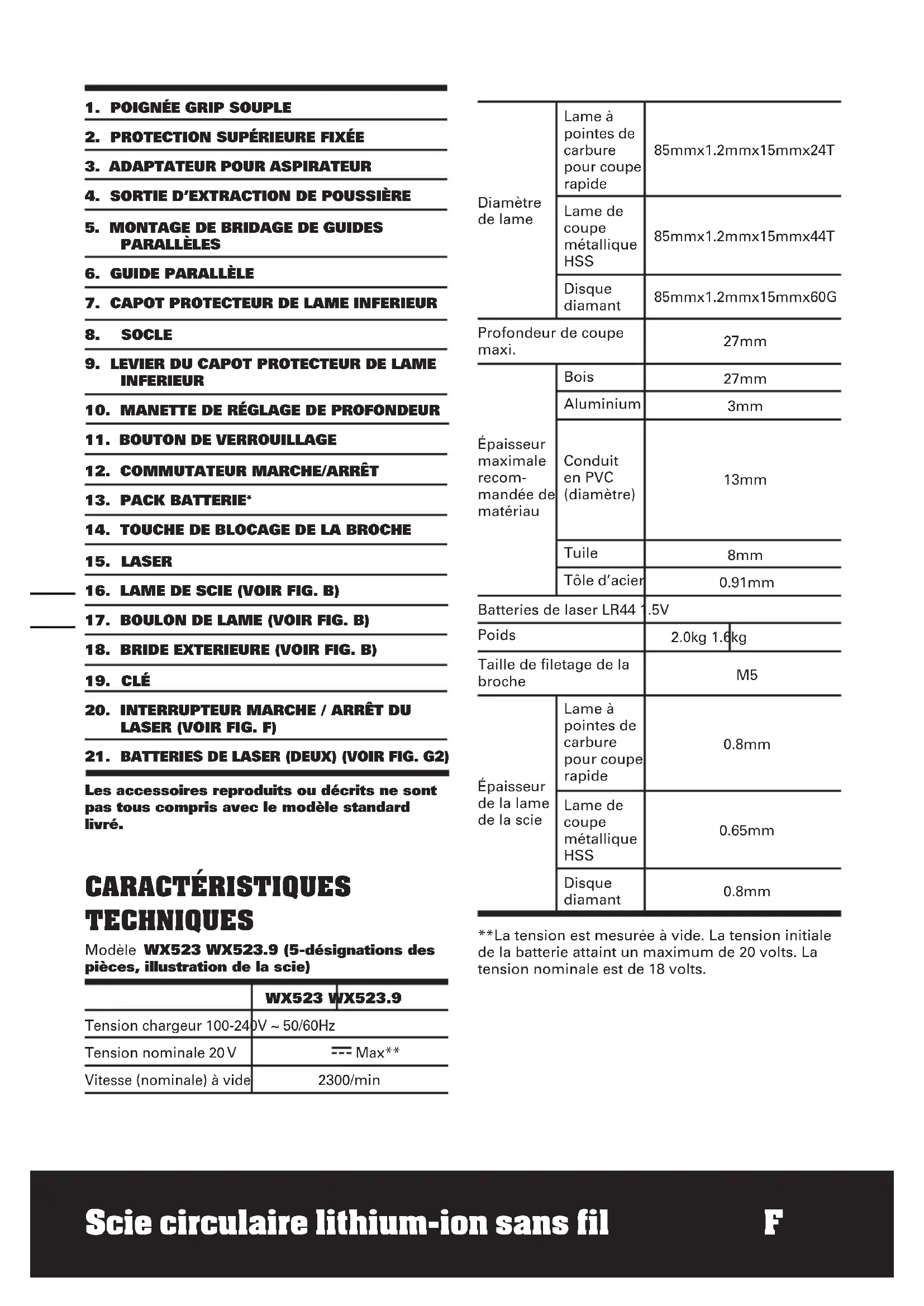 BATTERIES DE LASER (DEUX) (VOIR FIG. G2) Les accessoires reproduits ou décrits ne sont pas tous compris avec le modèle standard livré. CARACTÉRISTIQUES TECHNIQUES Modèle WX523 WX523.9 (5-désignations des pièces, illustration de la scie) WX523 WX523.9 Tension chargeur 100-240V ~ 50/60Hz Tension nominale 20 V Max** Vitesse (nominale) à vide 2300/min Diamètre de lame Lame à pointes de carbure pour coupe rapide 85mmx1.2mmx15mmx24T Lame de coupe métallique HSS 85mmx1.2mmx15mmx44T Disque diamant 85mmx1.2mmx15mmx60G Profondeur de coupe maxi. 27mm Épaisseur maximale recom- mandée de matériau Bois 27mm Aluminium 3mm Conduit en PVC (diamètre) 13mm Tuile 8mm Tôle d’acier 0.91mm Batteries de laser LR44 1.5V Poids 2.0kg 1.6kg Taille de filetage de la broche