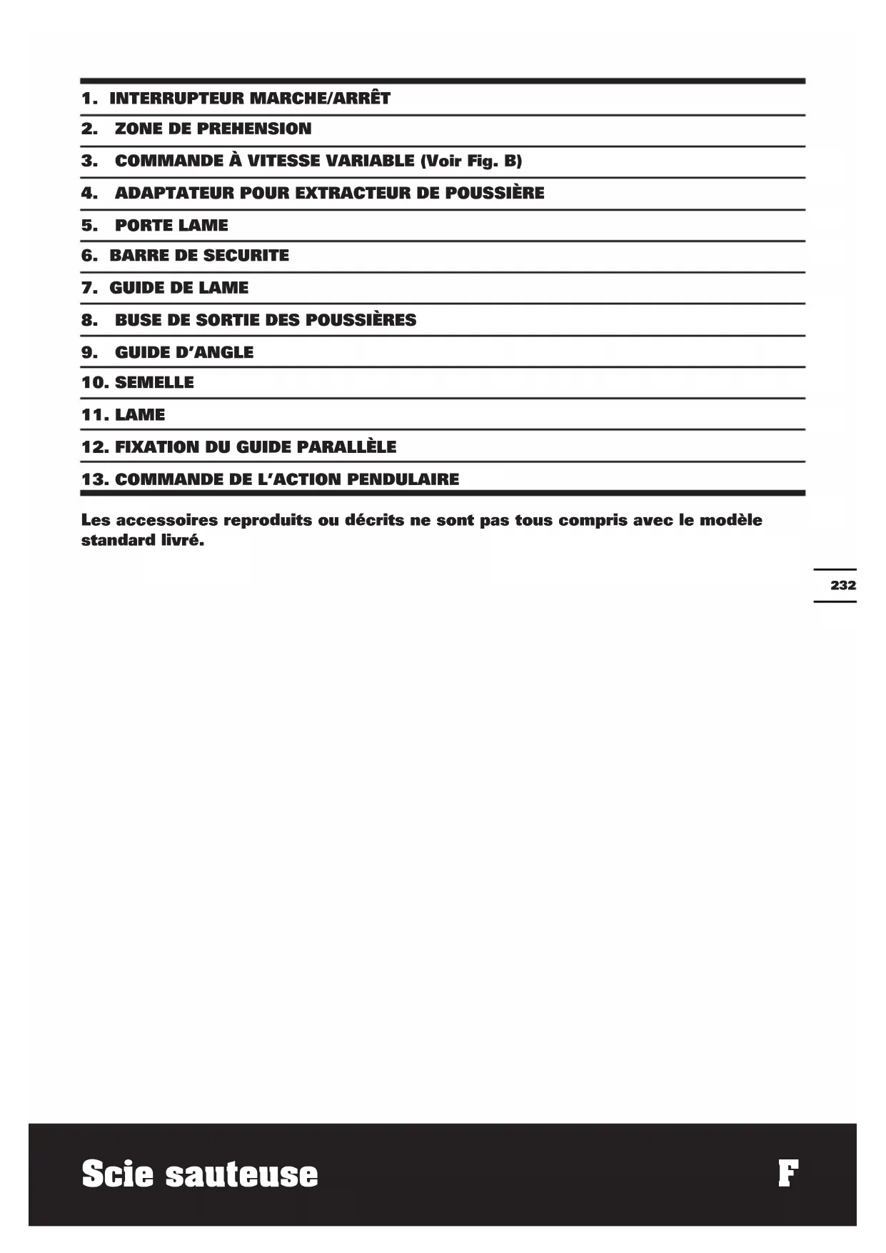 Les accessoires reproduits ou décrits ne sont pas tous compris avec le modèle standard livré. Scie sauteuse FScie sauteuse F