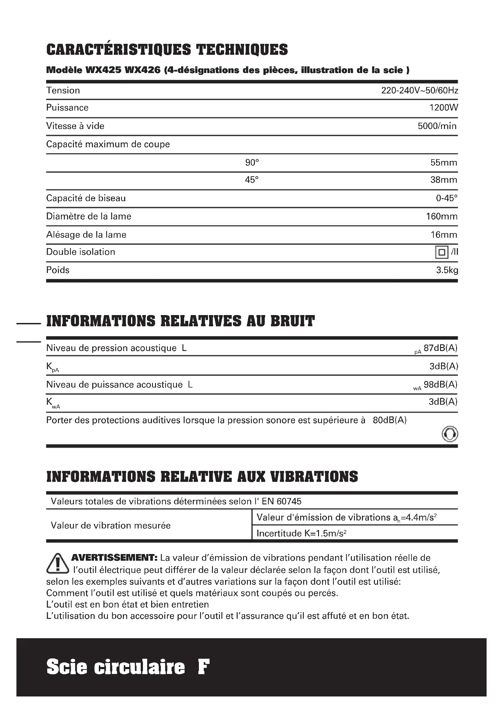 l’outil électrique peut différer de la valeur déclarée selon la façon dont l’outil est utilisé, selon les exemples suivants et d’autres variations sur la façon dont l’outil est utilisé: Comment l’outil est utilisé et quels matériaux sont coupés ou percés. L’outil est en bon état et bien entretien L’utilisation du bon accessoire pour l’outil et l’assurance qu’il est affuté et en bon état. Tension Puissance Vitesse à vide Capacité maximum de coupe 90° 45° Capacité de biseau Diamètre de la lame Alésage de la lame Double isolation Poids 220-240V~50/60Hz 1200W 5000/min 55mm 38mm 0-45° 160mm 16mm /II 3.5kgScie circulaire F