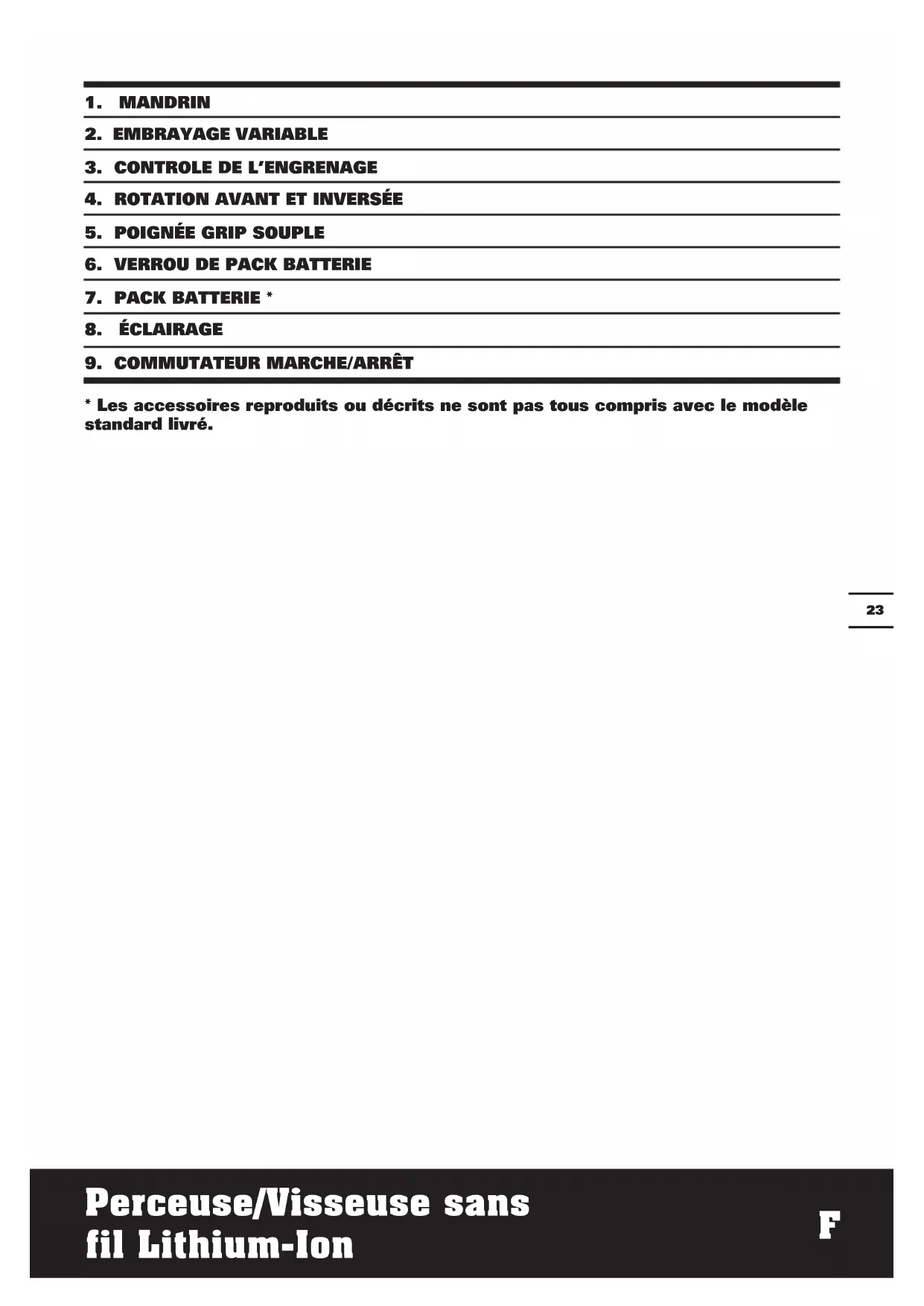 - Les accessoires reproduits ou décrits ne sont pas tous compris avec le modèle standard livré.24 perceuse/Visseuse sans fil Lithium-Ion