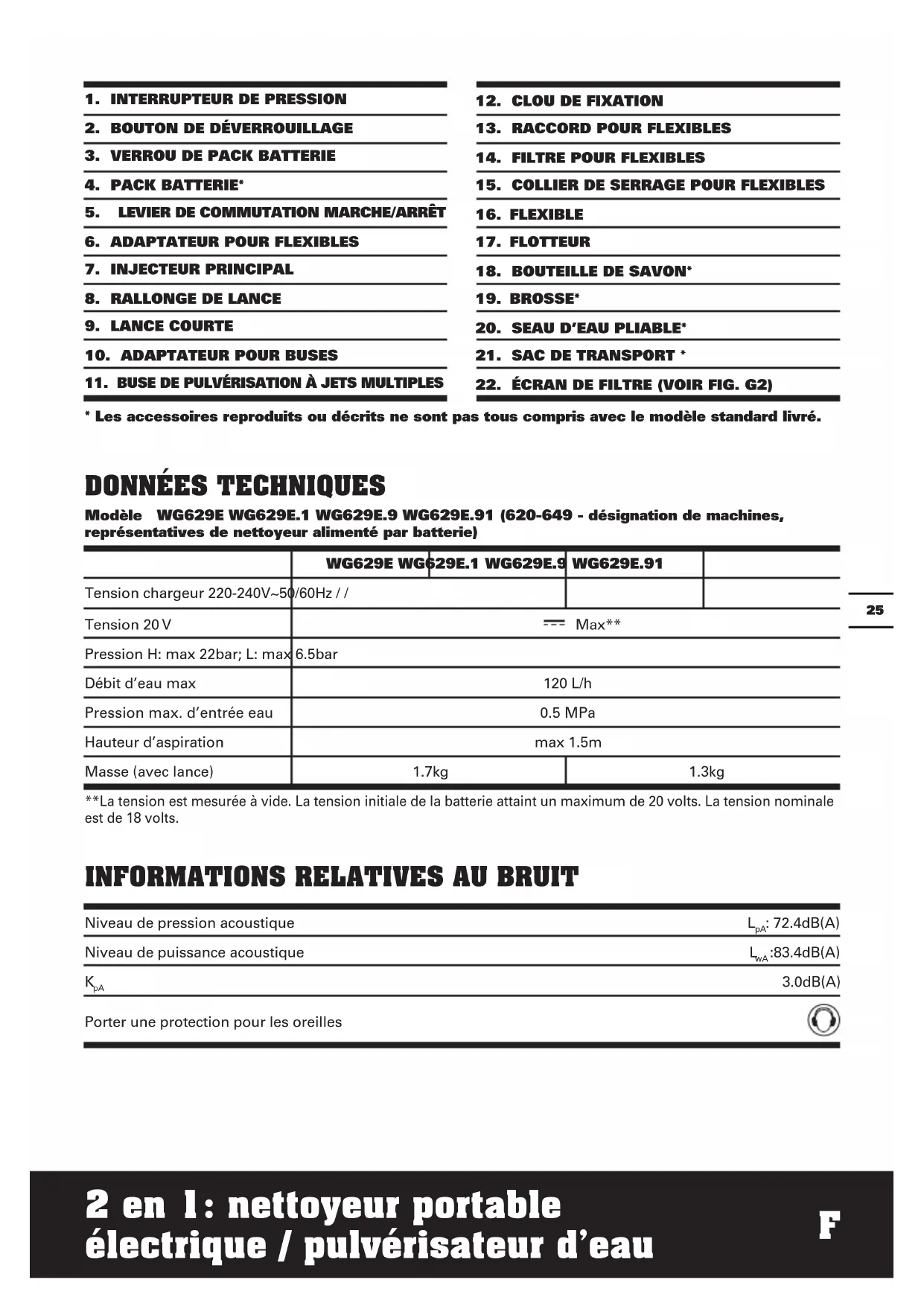 Modèle WG629E WG629E.1 WG629E.9 WG629E.91 (620-649 - désignation de machines, représentatives de nettoyeur alimenté par batterie)