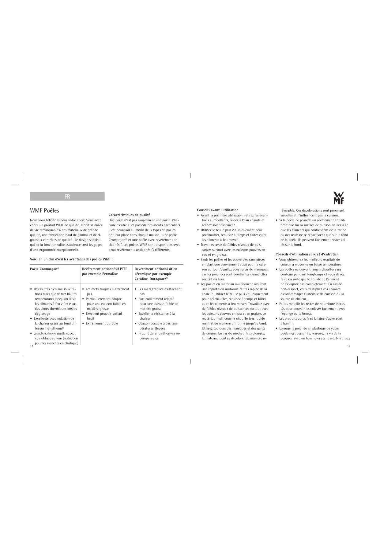 11WMF Poêles Nous vous félicitons pour votre choix. Vous avez choisi un produit WMF de qualité. Il doit sa durée de vie remarquable à des matériaux de grande qualité, une fabrication haut de gamme et de ri- goureux contrôles de qualité . Le design sophisti- qué et la fonctionnalité astucieuse sont les gages d‘une ergonomie exceptionnelle. Caractéristiques de qualité Une poêle n‘est pas simplement une poêle. Cha- cune d‘entre elles possède des atouts particuliers. C‘est pourquoi au moins deux types de poêles ont leur place dans chaque maison : une poêle Cromargan® et une poêle avec revêtement an- tiadhésif. Les poêles WMF sont disponibles avec deux revêtements antiadhésifs différents. Conseils avant l’utilisation