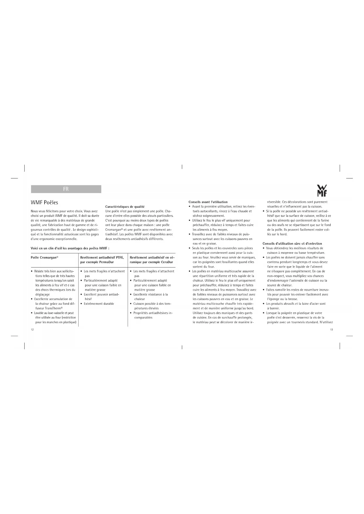 11WMF Poêles Nous vous félicitons pour votre choix. Vous avez choisi un produit WMF de qualité. Il doit sa durée de vie remarquable à des matériaux de grande qualité, une fabrication haut de gamme et de ri- goureux contrôles de qualité . Le design sophisti- qué et la fonctionnalité astucieuse sont les gages d‘une ergonomie exceptionnelle. Caractéristiques de qualité Une poêle n‘est pas simplement une poêle. Cha- cune d‘entre elles possède des atouts particuliers. C‘est pourquoi au moins deux types de poêles ont leur place dans chaque maison : une poêle Cromargan® et une poêle avec revêtement an- tiadhésif. Les poêles WMF sont disponibles avec deux revêtements antiadhésifs différents. Conseils avant l’utilisation