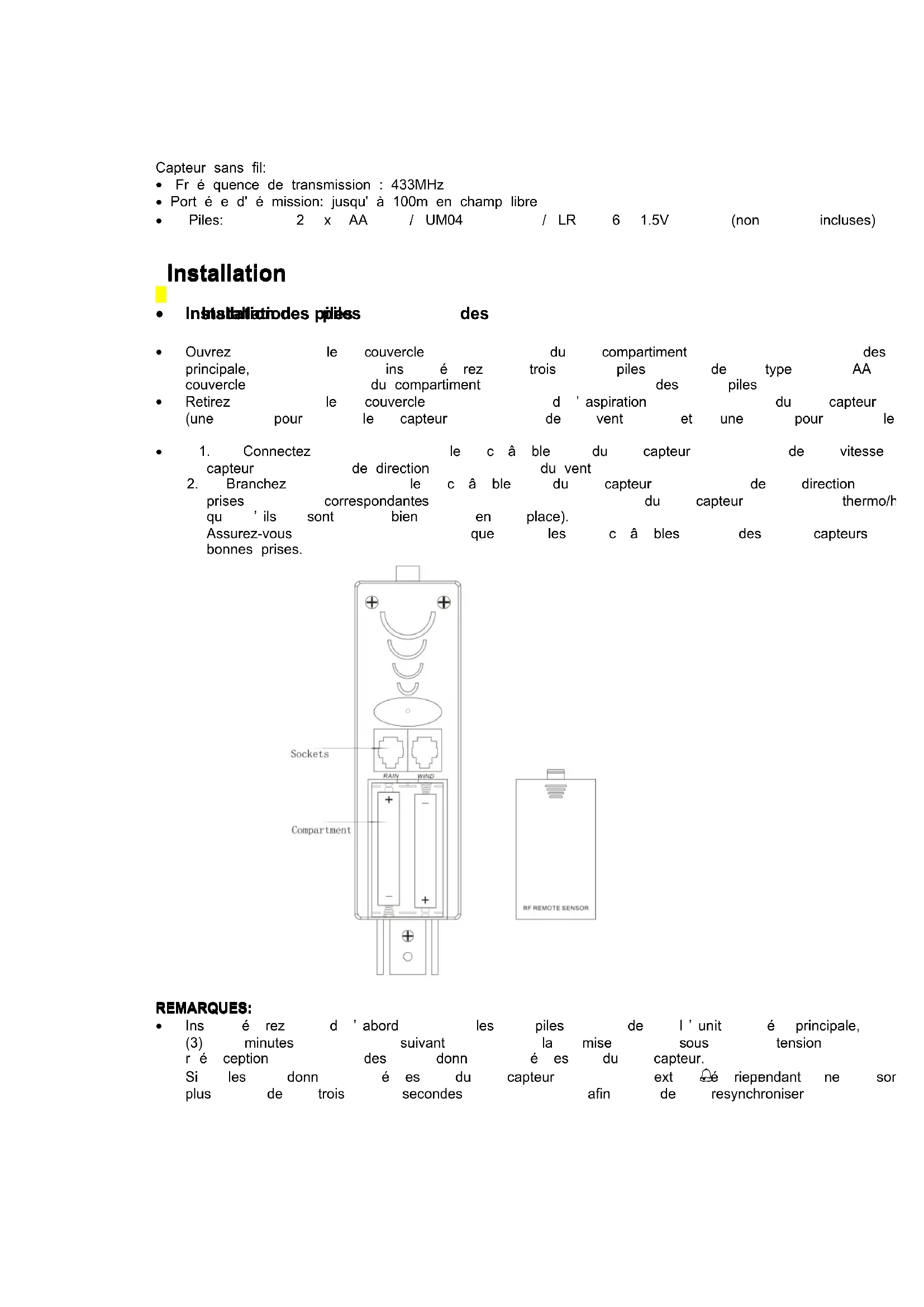 prises correspondantes du capteur thermo/hygro (vous devriez entendre un clic indiquant qu ’ ils sont bien en place). Assurez-vous que les c â bles des capteurs de vent et de pluie sont branch é s sur les bonnes prises. REMARQUES: REMARQUES: REMARQUES: REMARQUES:
