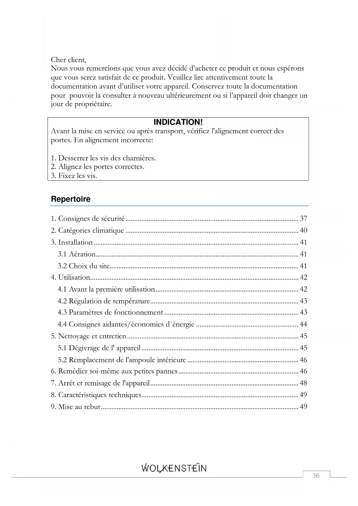 with not being limited to fires or explosions. The guarantee claims neither extend the guarantee period nor initiate a new guarantee period. The geographical scope of the guarantee is limited with respect to appliances, which are purchased and used in Germany, Austria, Belgium, Luxembourg and the Netherlands. August 201436 Cher client, Nous vous remercions que vous avez décidé d’acheter ce produit et nous espérons que vous serez satisfait de ce produit. Veuillez lire attentivement toute la documentation avant d’utiliser votre appareil. Conservez toute la documentation pour pouvoir la consulter à nouveau ultérieurement ou si l’appareil doit changer un jour de propriétaire. INDICATION! Avant la mise en service ou après transport, vérifiez l'alignement correct des portes. En alignement incorrecte: