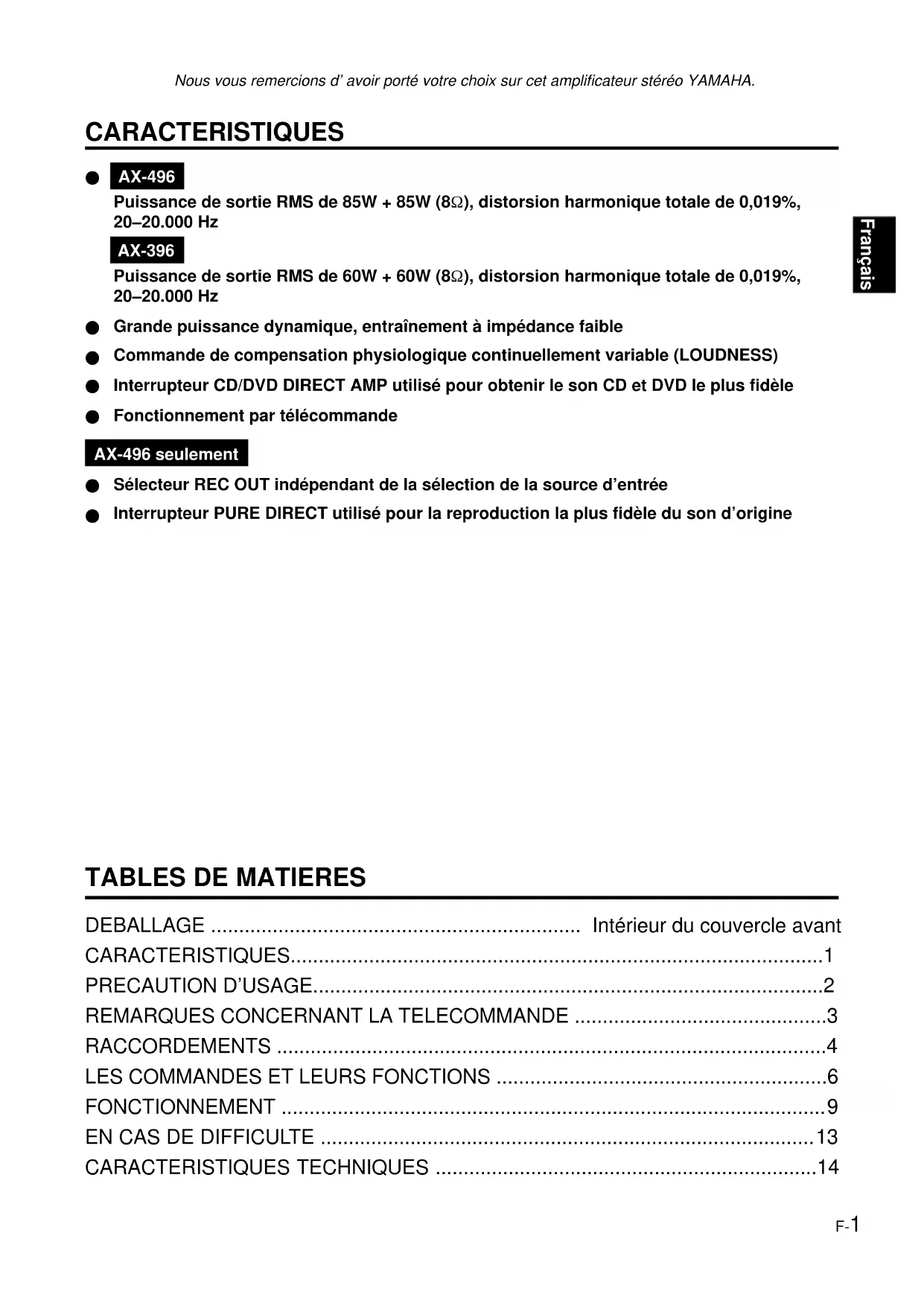 Se reporter au tableau ci-dessous lorsque l’appareil ne fonctionne pas correctement. Si le problème rencontré n’est pas décrit ci-dessous ou si les instructions données ne suffisent pas à le résoudre, débrancher le cordon d’alimentation et s’adresser à son concessionnaire ou son centre de service YAMAHA.F-14 CARACTERISTIQUES TECHNIQUES Section alimentation Puissance de sortie minimum RMS 8Ω, 20 Hz à 20 kHz, 0,019% de DHT <AX-496> ...................................................... 85W+85W <AX-396> ...................................................... 60W+60W Puissance de sortie maximum (EIAJ) (1 kHz, 10% de DHT) <AX-496> 8/6Ω ........................................................................ 130/150W <AX-396> 6Ω ................................................................................... 110W Puissance dynamique (IHF) 8/6/4/2Ω <AX-496> ........................................ 130/150/185/220W <AX-396> ........................................ 100/120/140/150W Puissance de sortie standard DIN (4Ω, 1 kHz, 0,7% de DHT) <AX-496>................................................................ 120W <AX-396>.................................................................. 95W Puissance de sortie IEC (8Ω, 1 kHz, 0,019% de DHT) <AX-496>................................................................ 100W <AX-396>.................................................................. 75W Largeur de bande de puissance 8Ω, demi-puissance, 0,04% de DHT ......... 10 Hz à 50 kHz Facteur d’amortissement 8Ω, 20 Hz à 20 kHz ......................................................240 Réponse en fréquence ................... 20 Hz à 20 kHz50,5 dB Distorsion harmonique totale (20 Hz à 20 kHz) CD/DVD à SP OUT (8Ω, demi-puissance) .............0,008% Rapport signal/bruit (IHF réseau A) CD/DVD (Entrée court-circuitée, CD/DVD DIRECT AMP: ON) ................................................................110 dB PHONO (Entrée court-circuitée) .............................. 88 dB Bruit résiduel (IHF réseau A) CD/DVD DIRECT AMP: ON .................................... 35 µV Section commandes Sensibilité d’entrée/impédance CD/DVD, etc. ............................................... 150 mV/47 kΩ PHONO ........................................................2,5 mV/47 kΩ Niveau de sortie REC OUT ...................................................150 mV/1,6 kΩ Sortie de casque ................................................0,25V/680Ω Séparation des canaux (1 kHz/10 kHz) CD/DVD (Entrée terminée 5,1 kΩ) ................. 65 dB/50 dB Caratéristiques de contrôle de la tonalité Graves (BASS) ......................................... 510 dB (20 Hz) Aiguës (TREBLE) ................................... 510 dB (20 kHz) Commande de compensation physiologique continue (LOUDNESS) Atténuation .................................................–30 dB (1 kHz) Général Alimentation [Modèles pour l’Europe et le Royaume-Uni] .................................................................. CA 230V, 50 Hz [Modèle pour l’Australie] ........................... CA 240V, 50 Hz [Modèle pour la Chine] ............................. CA 220V, 50 Hz [Modèle pour général]...... CA 110/120/220/240V, 60/50 Hz Consommation <AX-496>.................................................. Environ 210W <AX-396>................................................... Environ 150W Prises CA 3 prises commutées [Modèles pour l’Europe, la Chine et général] .......................................................... 100W max. au total 1 prise commutée [Modèles pour le Royaume-Uni et l’Australie] .......................................................... 100W max. au total Dimensions (L x H x P) ........................ 435 x 151 x 391 mm Poids <AX-496>................................................................ 9,5 kg <AX-396>................................................................ 8,7 kg Accessoires.................................................. Télécommande Piles Caractéristiques techniques modifiables sans préavis.Deutsch D-1Vielen Dank für den Kauf des Stereoverstärkers von YAMAHA. BESONDERHEITEN
