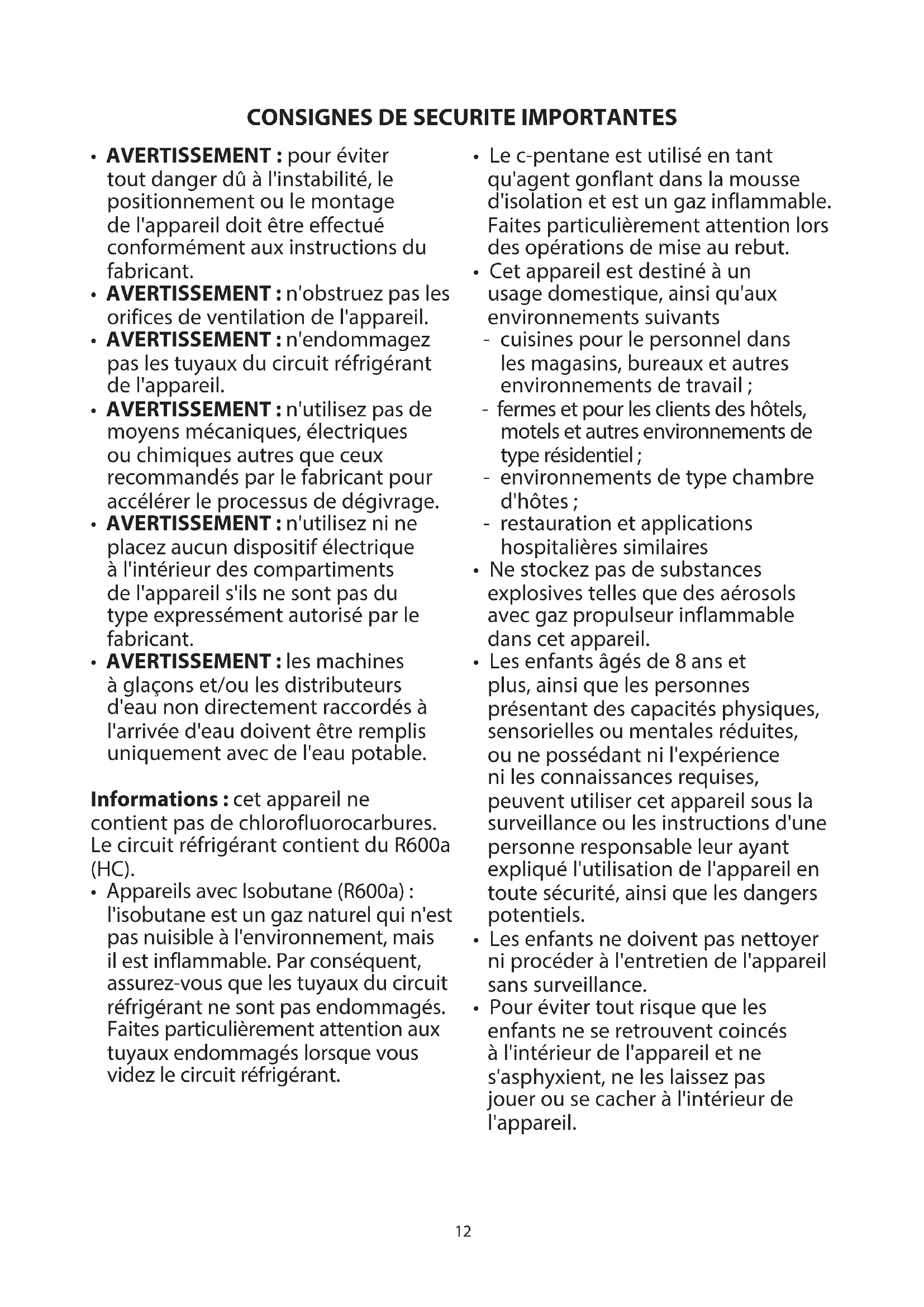- AVERTISSEMENT: les machines à glaçons et/ou les distributeurs d'eau non directement raccordés à l'arrivée d'eau doivent être remplis uniquement avec de l'eau potable. Informations: cet appareil ne contient pas de chlorofluorocarbures. Le circuit réfrigérant contient du R600a (HC).