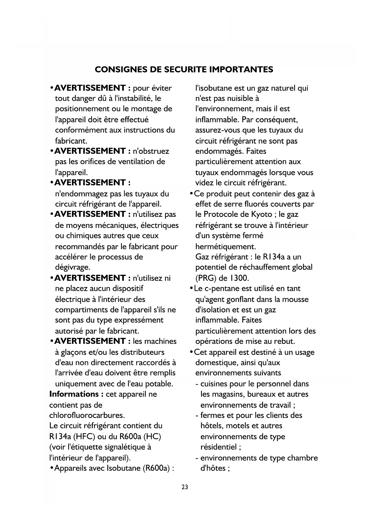 - AVERTISSEMENT : les machines à glaçons et/ou les distributeurs d'eau non directement raccordés à l'arrivée d'eau doivent être remplis uniquement avec de l'eau potable. Informations : cet appareil ne contient pas de chlorofluorocarbures. Le circuit réfrigérant contient du R134a (HFC) ou du R600a (HC) (voir l'étiquette signalétique à l'intérieur de l'appareil).