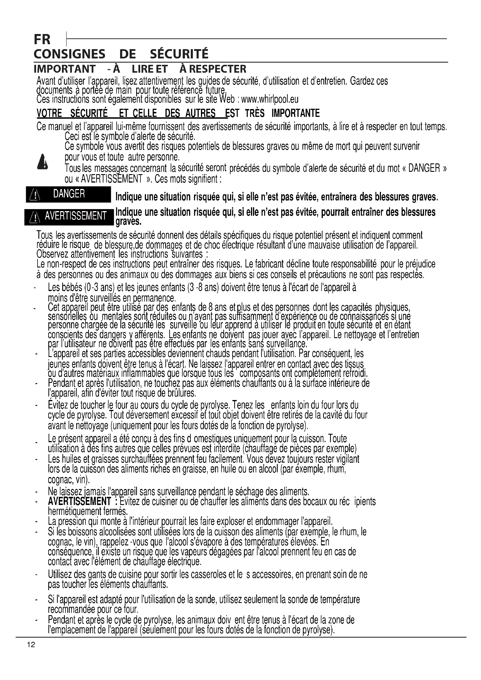 d’entretien. Gardez ces documents à portée de main pour toute référence future. Ces instructions sont également disponibles sur le site Web : www.whirlpool.eu VOTRE SÉCURITÉ ET CELLE DES AUTRES EST TRÈS IMPORTANTE Ce manuel et l’appareil lui-même fournissent des avertissements de sécurité importants, à lire et à respecter en tout temps. Ceci est le symbole d’alerte de sécurité. Ce symbole vous avertit des risques potentiels de blessures graves ou même de mort qui peuvent survenir pour vous et toute autre personne. Tous les messages concernant