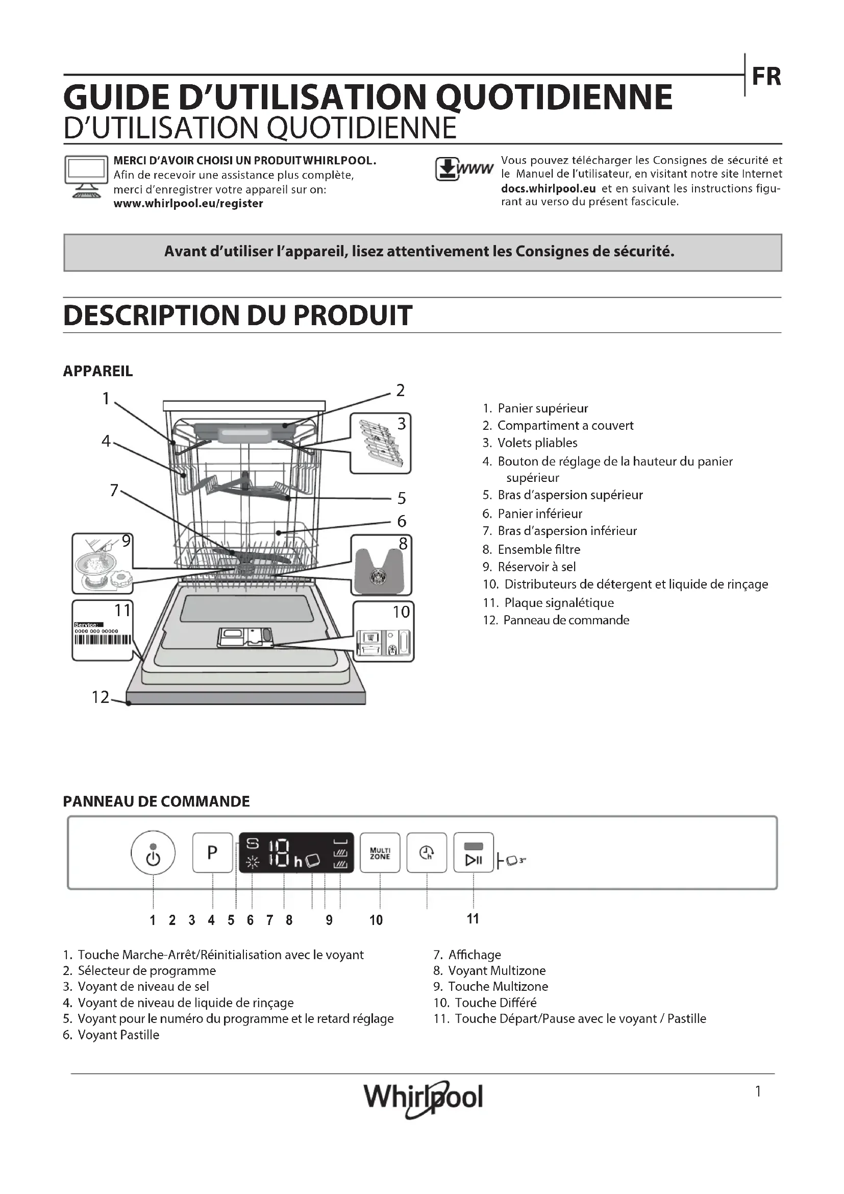 APPAREILPANNEAU DE COMMANDEMERCI D’AVOIR CHOISI UN PRODUIT WHIRLPOOL Afin de recevoir une assistance plus complète, merci d’enregistrer votre appareil sur on: www.whirlpool.eu/registerVous pouvez télécharger les Consignes de sécurité et le Manuel de l’utilisateur, en visitant notre site Internet docs.whirlpool.eu et en suivant les instructions figu-rant au verso du présent fascicule.1. Panier supérieur2. Compartiment a couvert3. Volets pliables4. Bouton de réglage de la hauteur du panier supérieur5. Bras d’aspersion supérieur6. Panier inférieur7. Bras d’aspersion inférieur8. Ensemble ltre9. Réservoir à sel10. Distributeurs de détergent et liquide de rinçage11. Plaque signalétique12. Panneau de commande1. Touche Marche-Arrêt/Réinitialisation avec le voyant2. Sélecteur de programme3. Voyant de niveau de sel4. Voyant de niveau de liquide de rinçage5. Voyant pour le numéro du programme et le retard réglage6. Voyant Pastille7. Achage8. Voyant Multizone9. Touche Multizone10. Touche Diéré11. Touche Départ/Pause avec le voyant / Pastille1 2 3 4 5 6 7 8 9 10