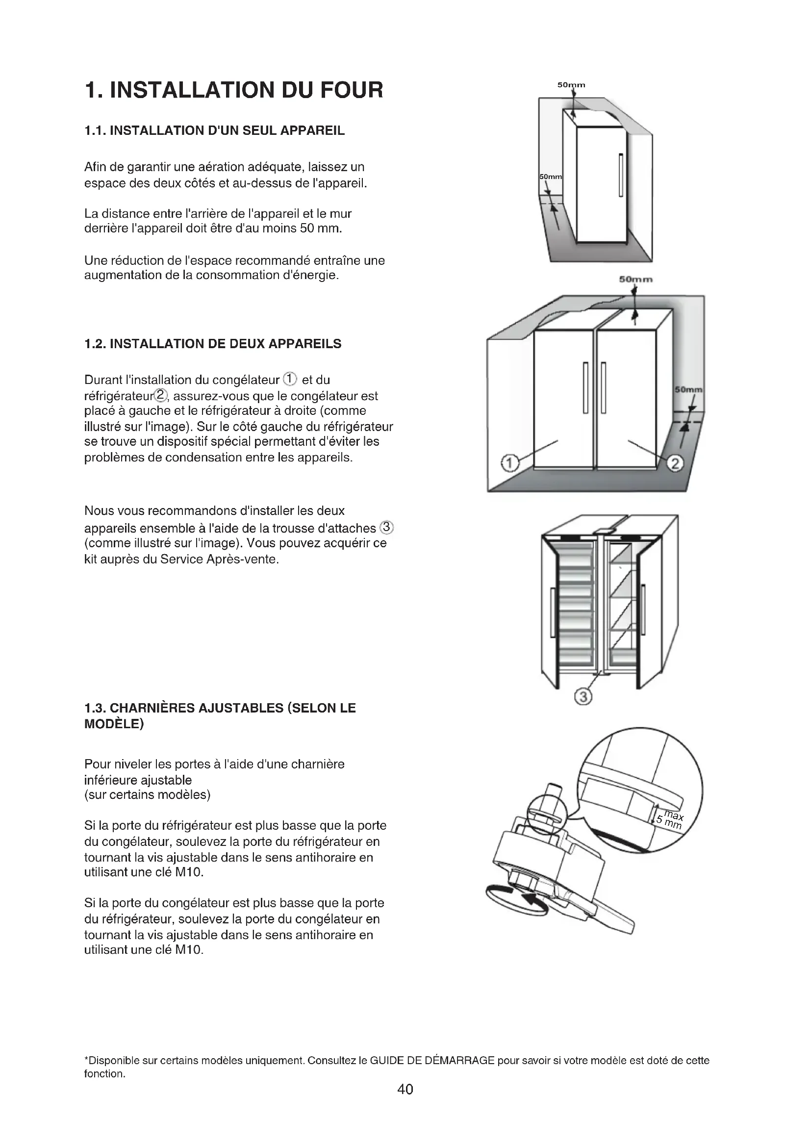 , assurez-vous que le congélateur est placé à gauche et le réfrigérateur à droite (comme illustré sur l'image). Sur le côté gauche du réfrigérateur se trouve un dispositif spécial permettant d'éviter les problèmes de condensation entre les appareils. Nous vous recommandons d'installer les deux appareils ensemble à l'aide de la trousse d'attaches