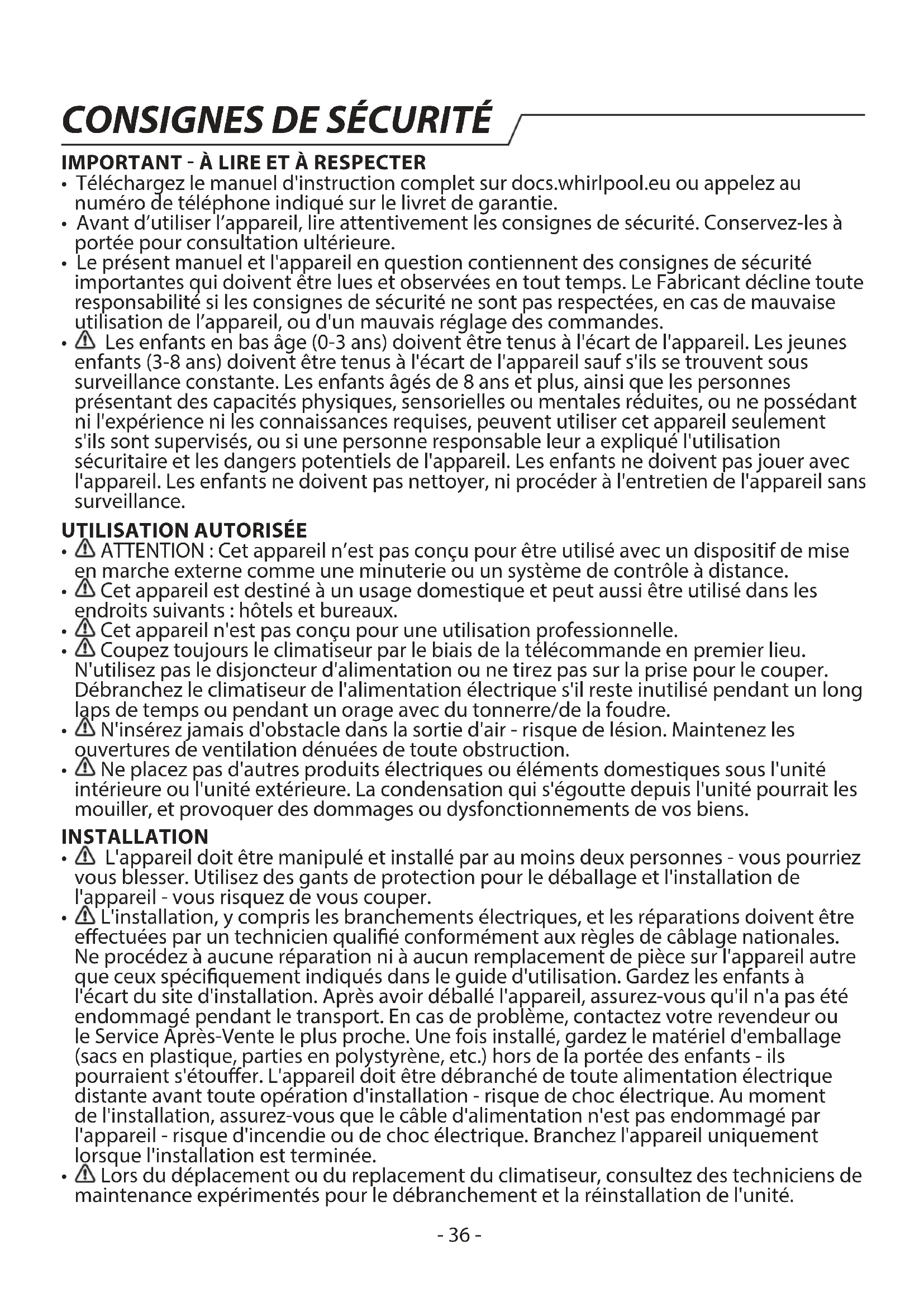 L'installation, y compris les branchements électriques, et les réparations doivent être eectuées par un technicien qualié conformément aux règles de câblage nationales. Ne procédez à aucune réparation ni à aucun remplacement de pièce sur l'appareil autre que ceux spéciquement indiqués dans le guide d'utilisation. Gardez les enfants à l'écart du site d'installation. Après avoir déballé l'appareil, assurez-vous qu'il n'a pas été endommagé pendant le transport. En cas de problème, contactez votre revendeur ou le Service Après-Vente le plus proche. Une fois installé, gardez le matériel d'emballage (sacs en plastique, parties en polystyrène, etc.) hors de la portée des enfants - ils pourraient s'étouer. L'appareil doit être débranché de toute alimentation électrique distante avant toute opération d'installation - risque de choc électrique. Au moment de l'installation, assurez-vous que le câble d'alimentation n'est pas endommagé par l'appareil - risque d'incendie ou de choc électrique. Branchez l'appareil uniquement lorsque l'installation est terminée.