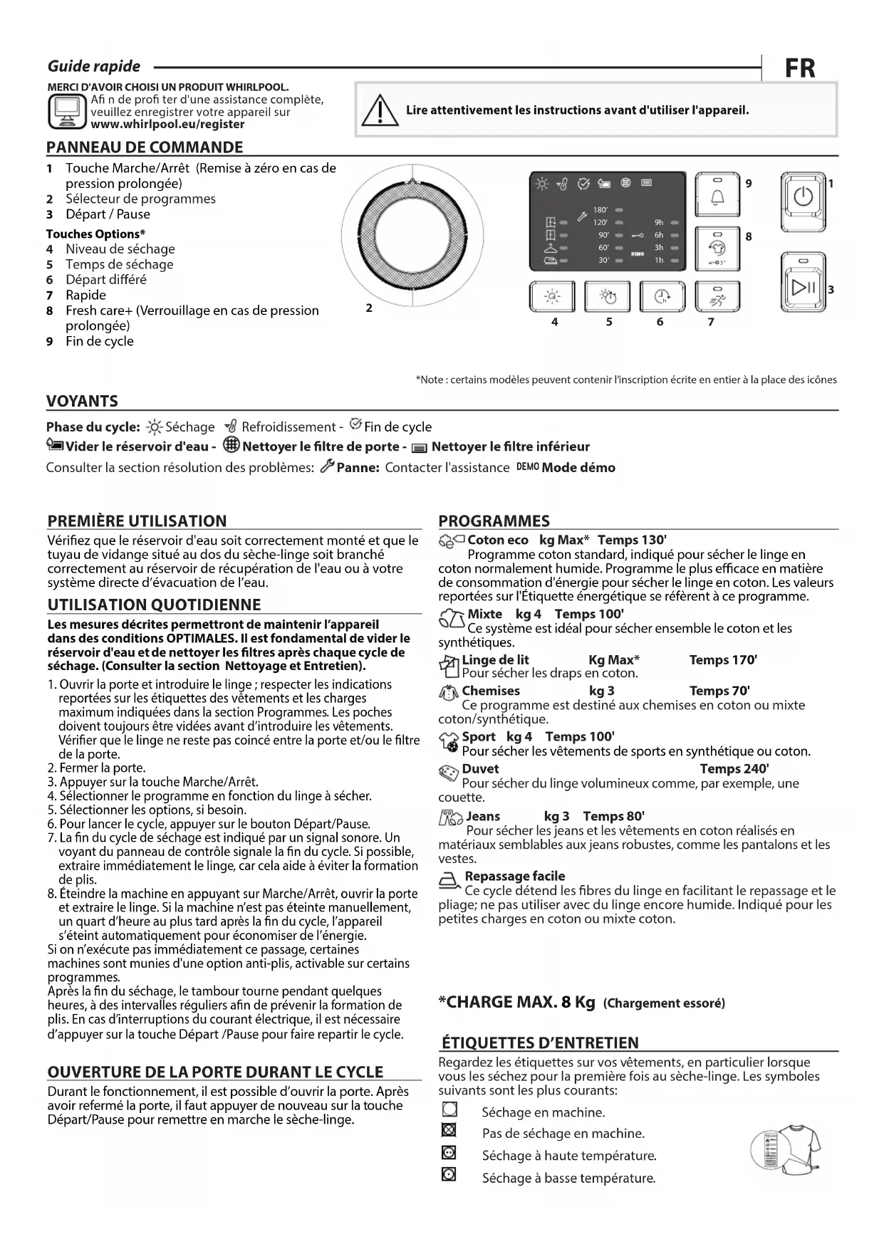 FT CM10 8B EU - Seche linge WHIRLPOOL - Notice d'utilisation et mode d'emploi gratuit